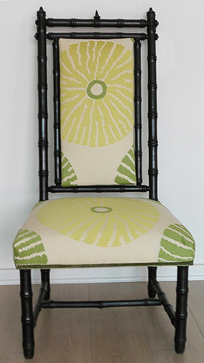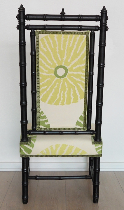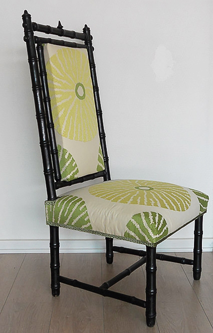 Chaise style chauffeuse en bois noirci à l'imitation du bambou, époque Napoléon III. Meuble entièrement restauré, garniture et tapisserie. Très beau tissu d'éditeur des années 60. Excellent état. A venir chercher à Montreuil.