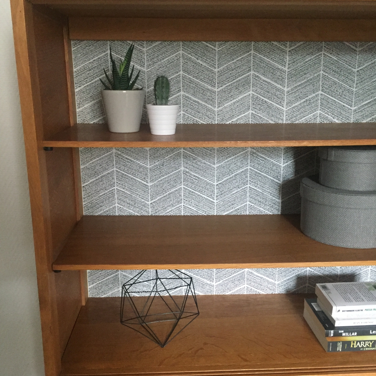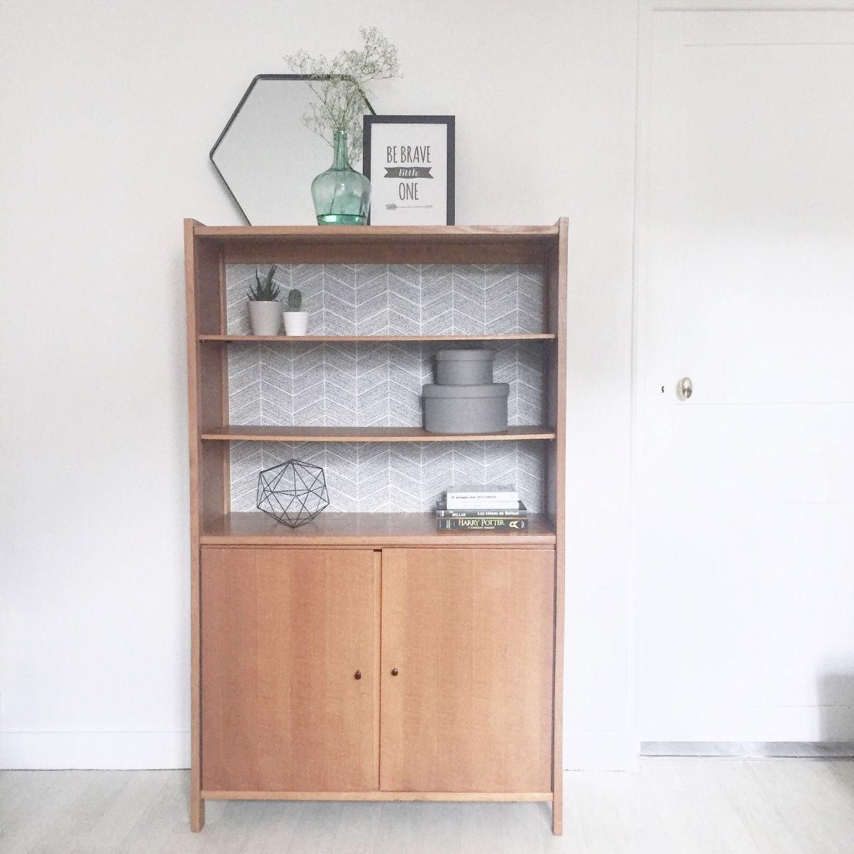 Très jolie ancienne vitrine des années 60 relookée avec du papier peint d'inspiration scandinave et vernis de couleur chêne clair. Présente quelques traces du temps qui font son charme.