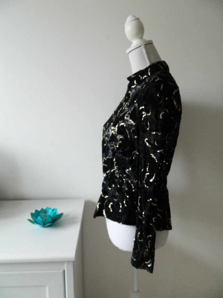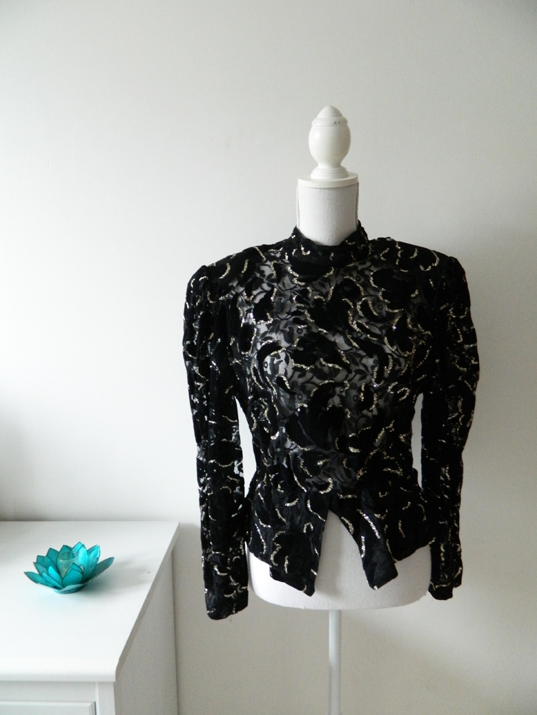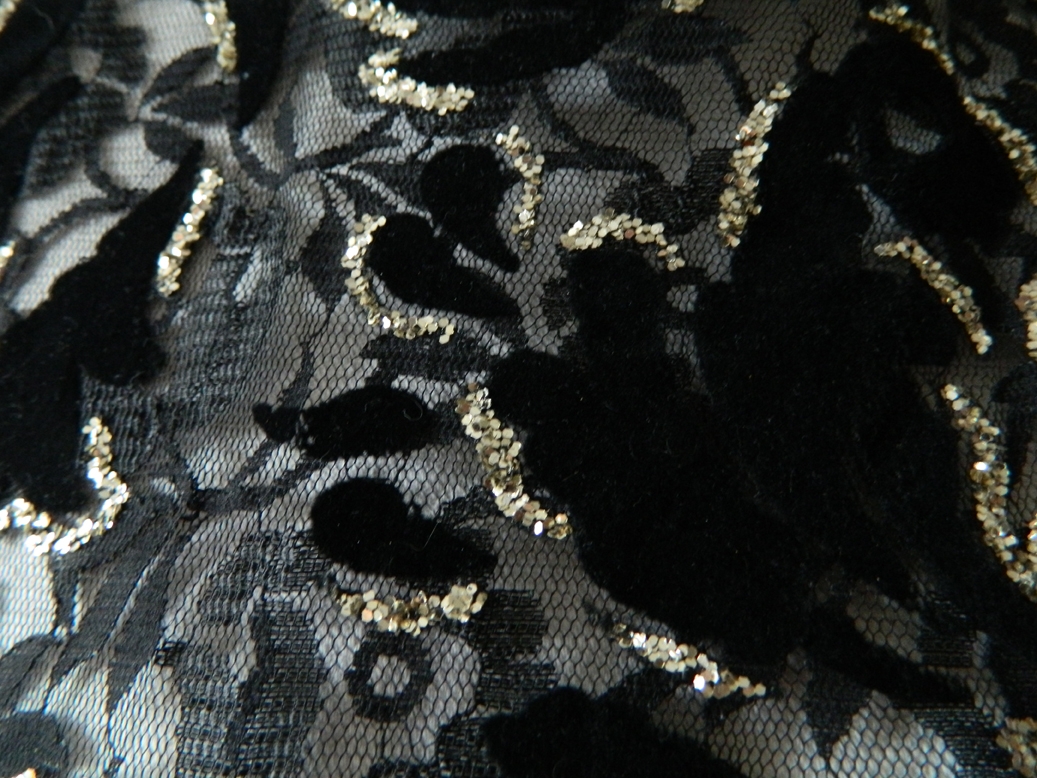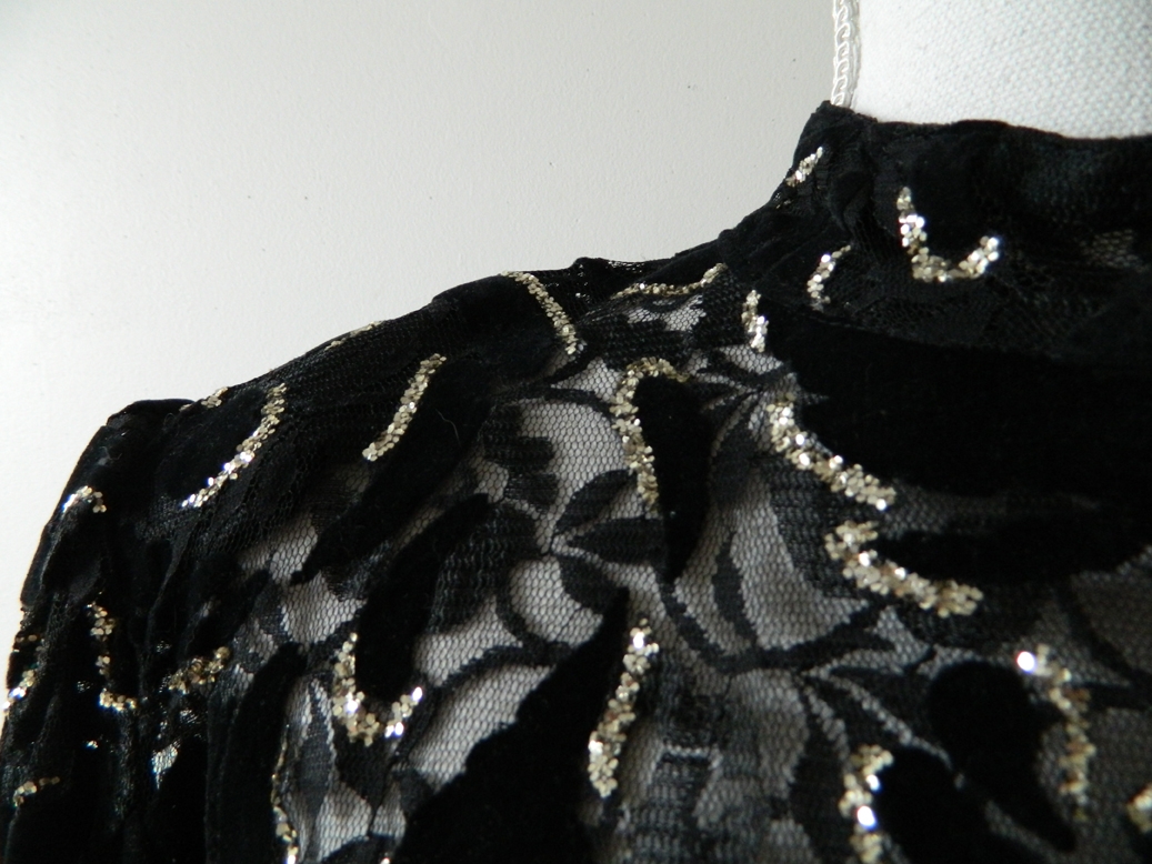 La blouse est en dentelle noire, recouverte d'empiècements en velours noir et de petites paillettes dorées.