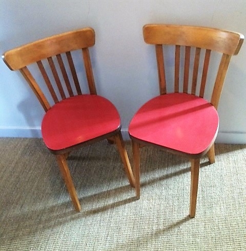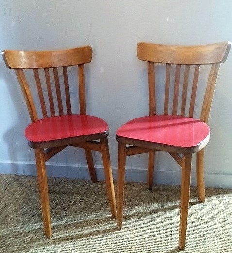 Paire de chaises bistrot, assise en formica rouge.