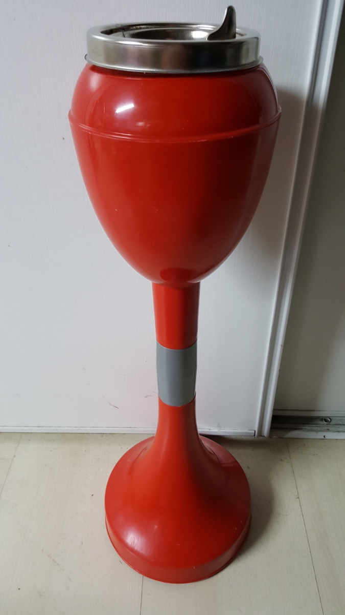 très beau cendrier sur pied de couleur rouge, en plastique et chrome. ouverture à clapet.