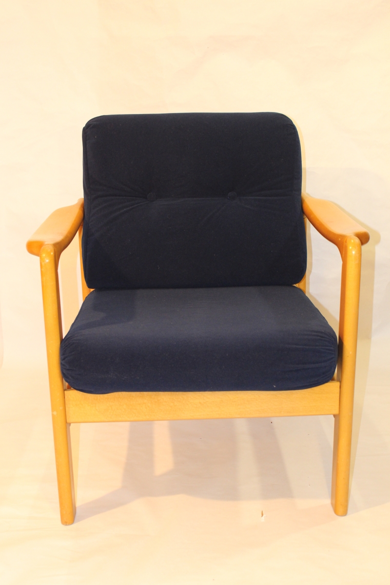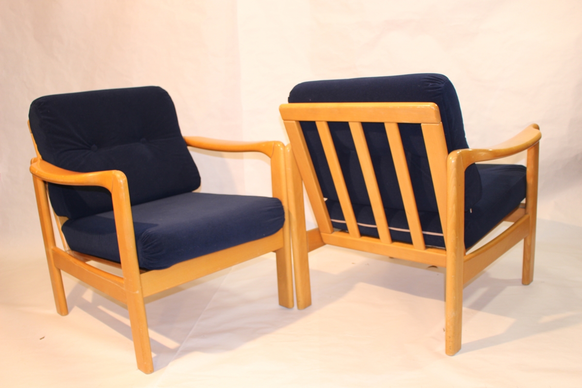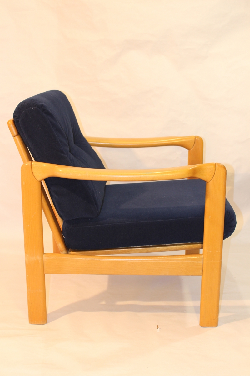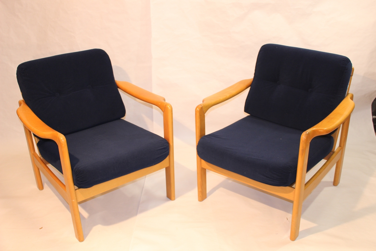Paire de fauteuils Scandinave années 60, coussins restaurés, coloris bleu nuit tissus velours haute gamme, structure en hêtre et en parfaite état, cependant quelques traces dû au temps sont visible mais n’enlève rien au prestige de la forme et du confort. Dimension : Profondeur 50 cm, hauteur total 80 cm, hauteur assise 40 cm, largeur assise 56 cm