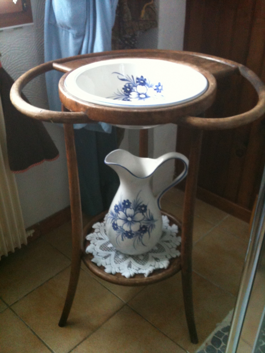très rare serviteur de toilette EN BOIS cintré en excellent état avec sa cuvette et son broc en faience.