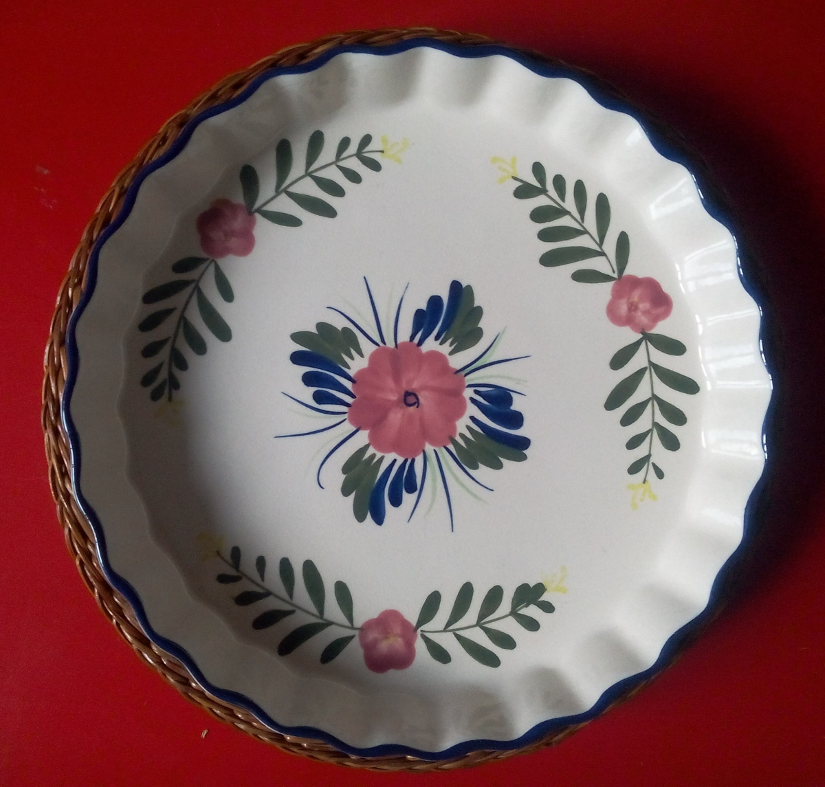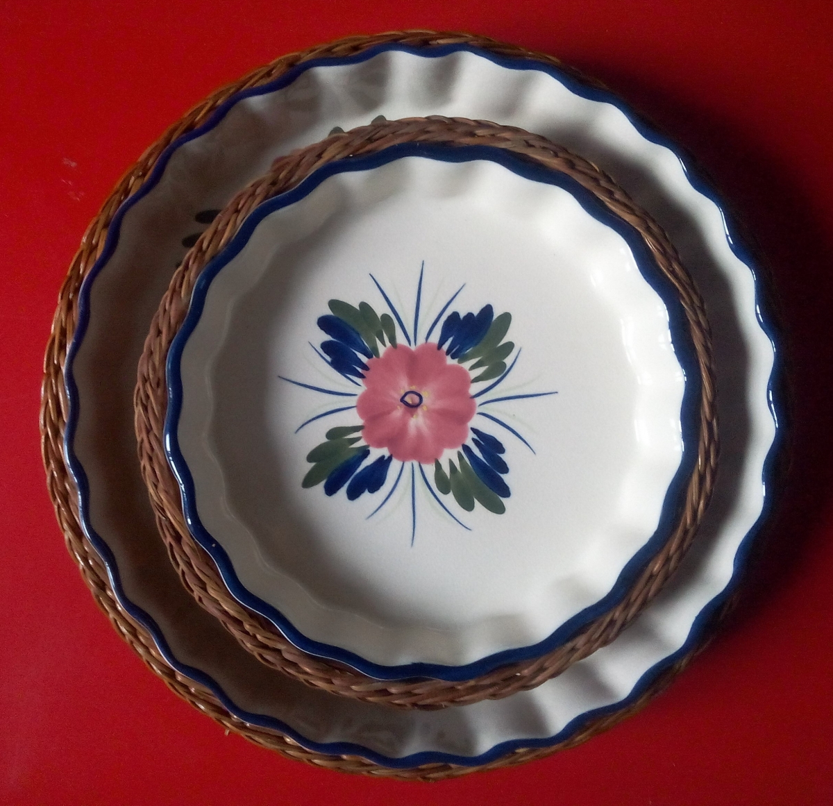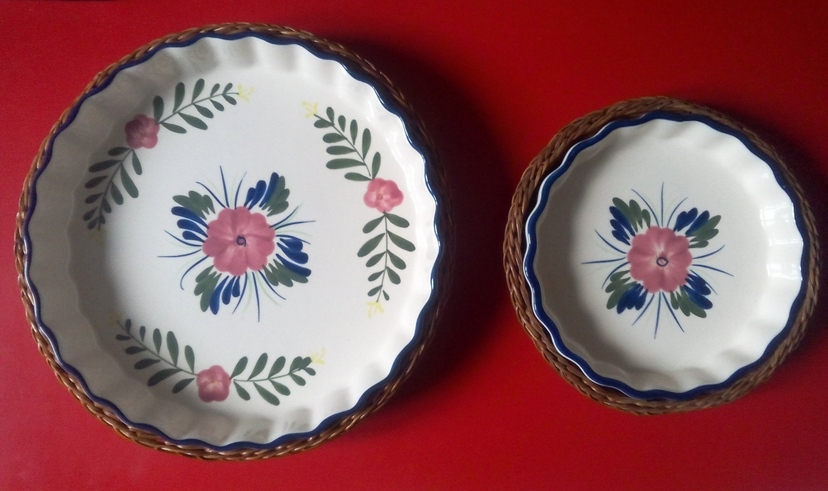 Deux moules à tarte décor floral dans leurs panières en osier.