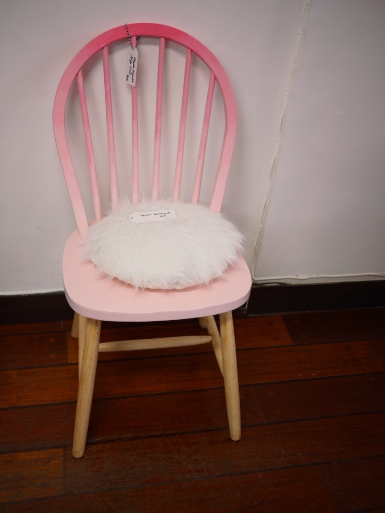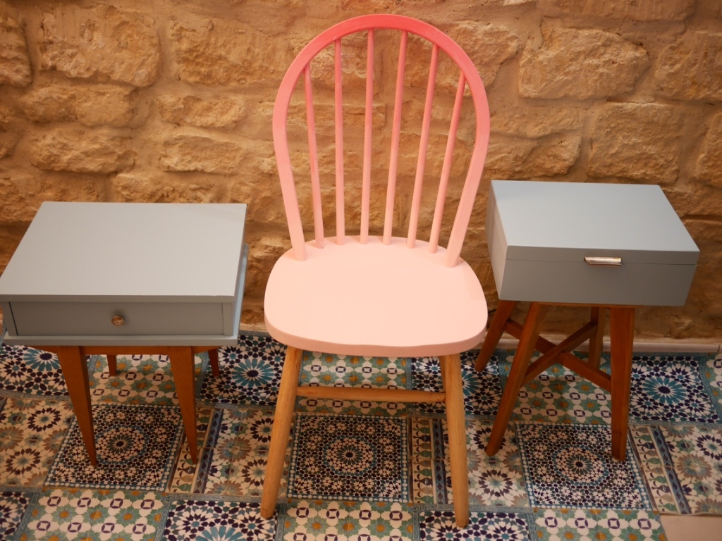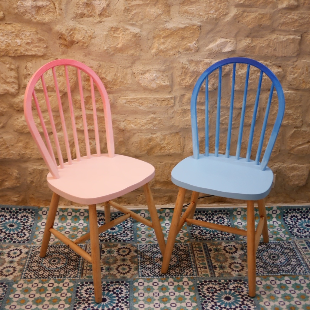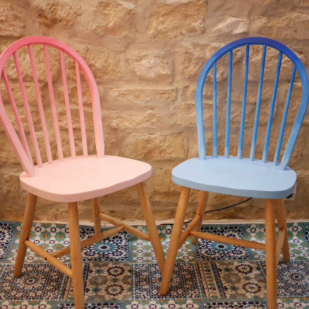 Jolie chaise style Ercol / Windsor à barreaux rénovée en dégradés irréguliers de couleurs roses