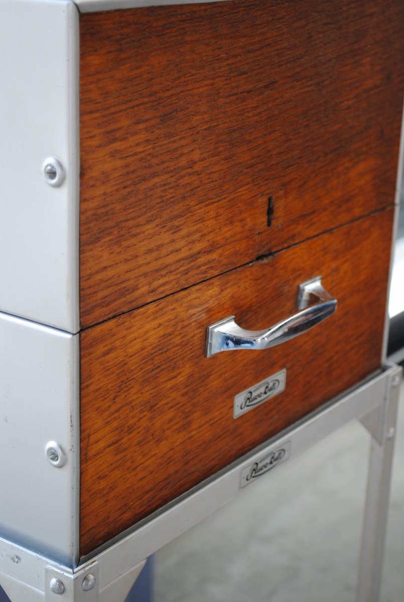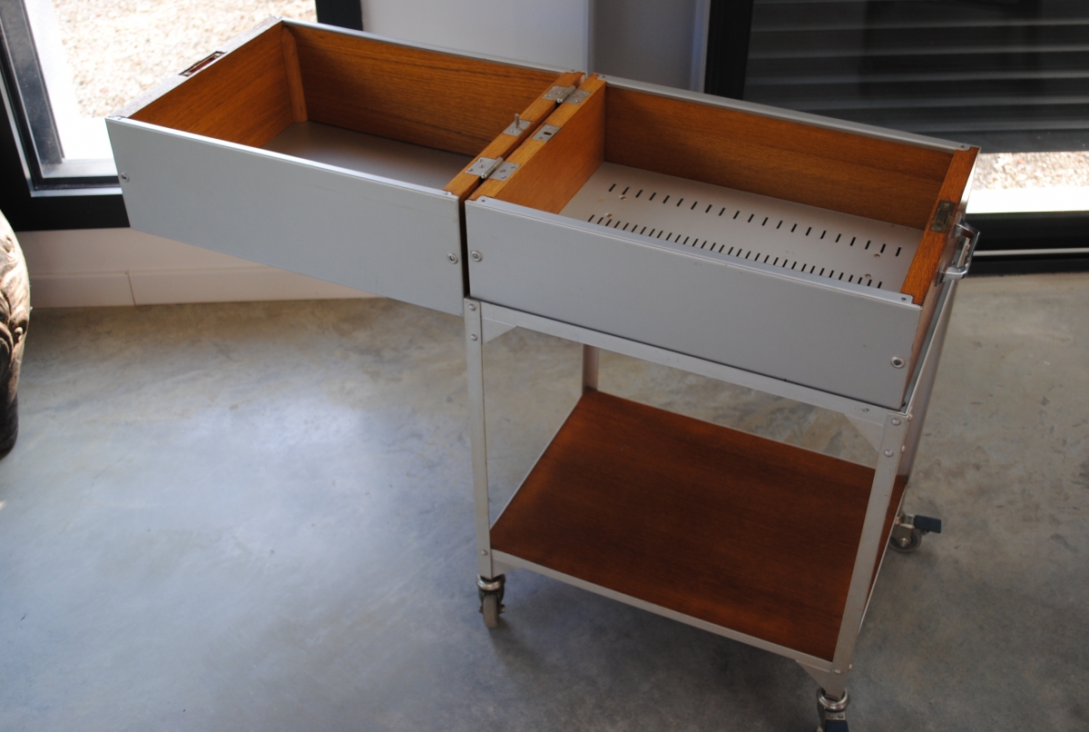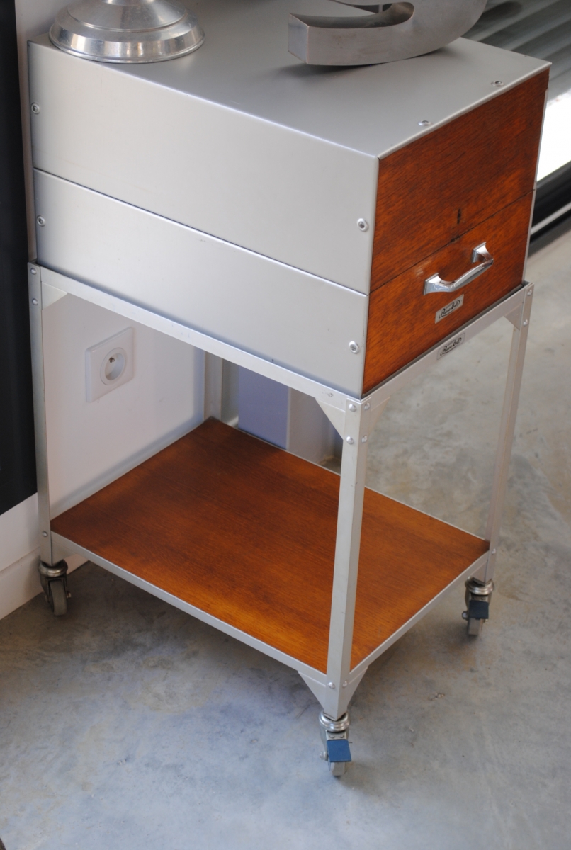 Petit meuble Ruwa Bell sur roulettes . Métal , alu et placage bois . Casier indépendant de la desserte .Hauteur 80Largeur 35Profondeur 48