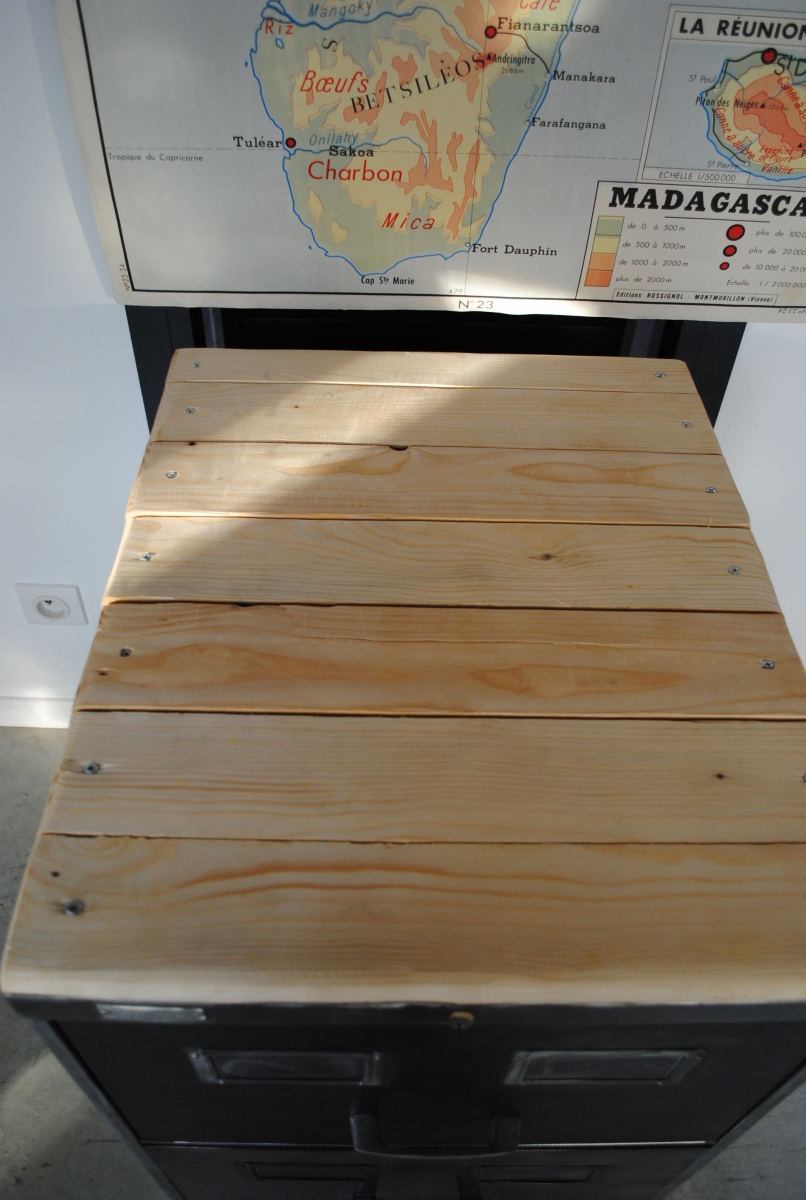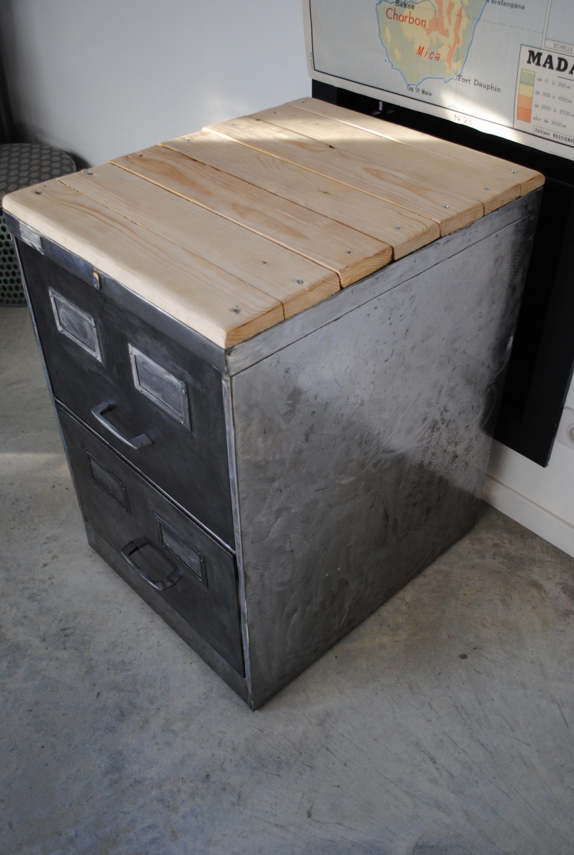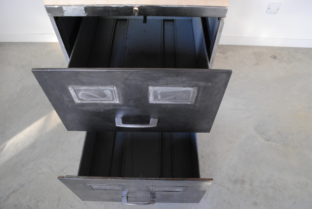 Meuble d'administration P.T.T à 2 tiroirs coulissants, profonds, de marque "Ronéo". Dessus bois , métal traité Graphite sur les tiroirs et brute vernis sur les autres faces . Hauteur 78cm Largeur 52 cm Profondeur 63 cm
