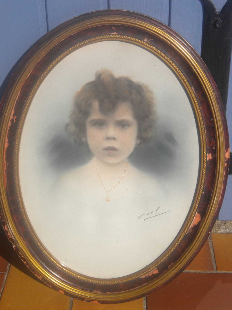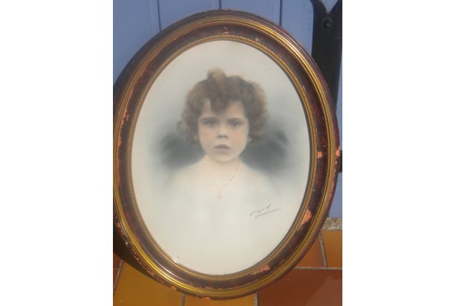 vieille photo colorisée d'enfant dans son cadre ovale + verre