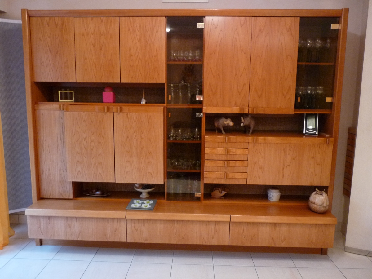 Meuble d'une jolie teinte miel je pense orme et placage orme, avec une grande capacité de rangement, belle qualité esthétique et fonctionnel.