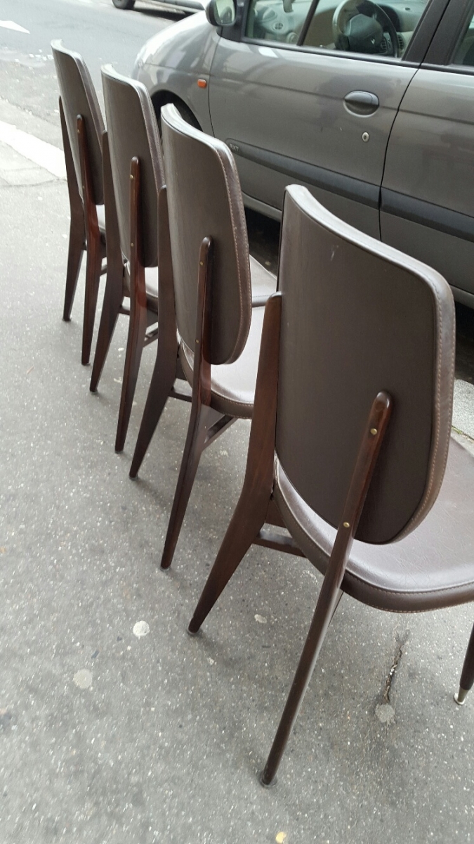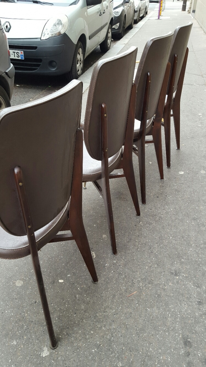 Quatre chaises en skaï et bois des années 60 couleur marron chocolat en très bon état. possibilité livraison a Paris 10 euros
