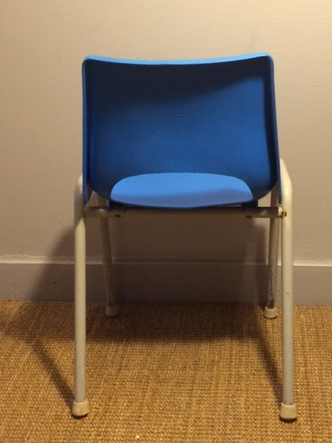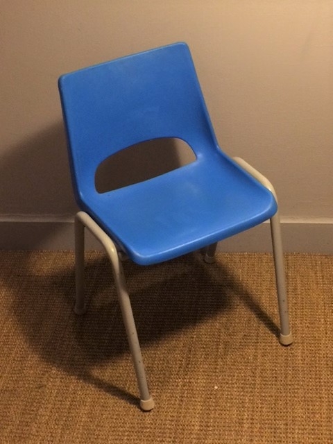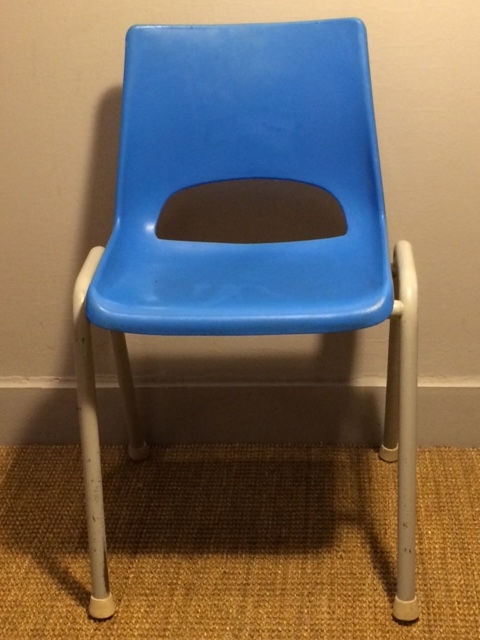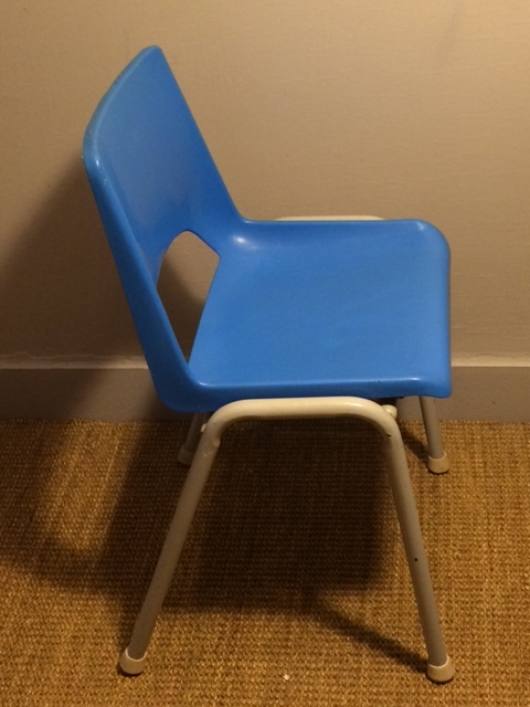 Chaise d'école maternelle , coque en plastique bleu et piétement métallique gris globalement en bon état malgré quelques rayures et traces d'usage. Hauteur : 56cm, largeur : 34cm, profondeur : 31cm. Hauteur de l'assise : 34cm.