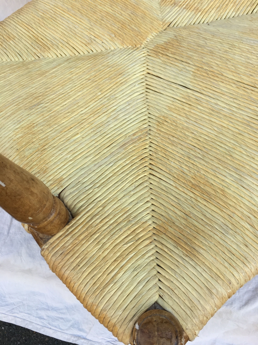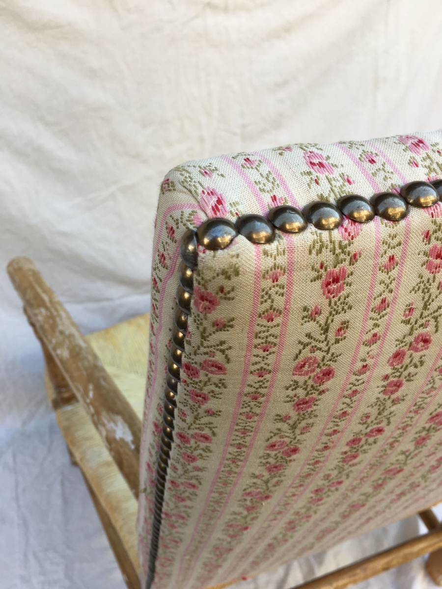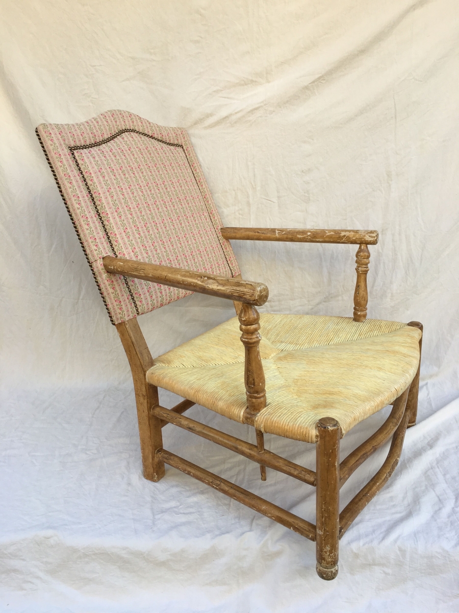 Il est composé d'une structure en bois avec une assise paillée et un dossier rembourré et garni de tissus motif fleuri.