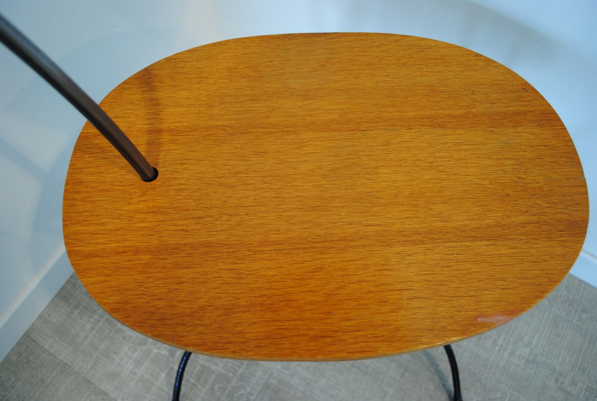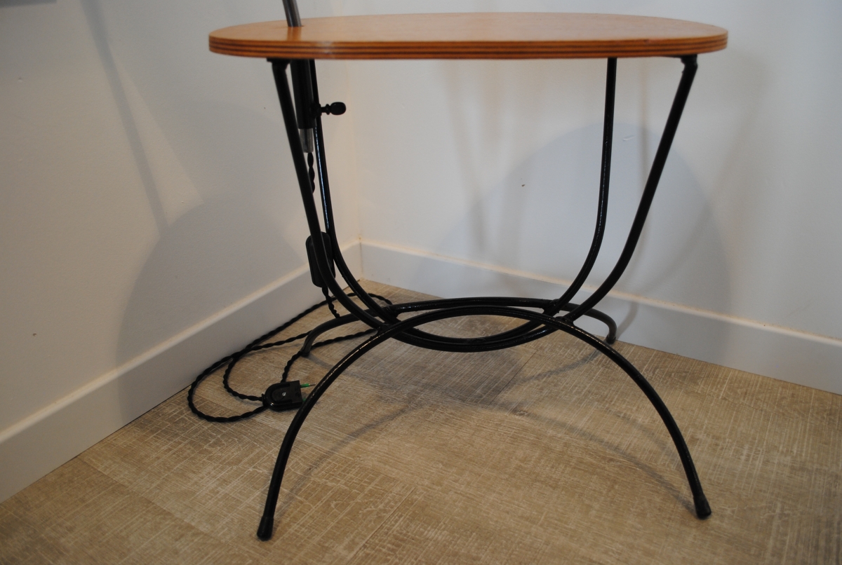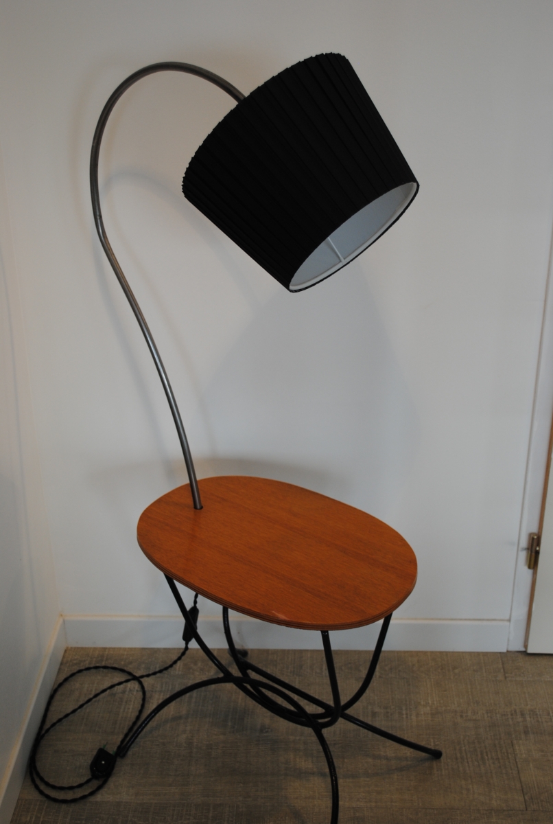 Lampadaire table année 70 , tablette en contre plaquée (petite accident sur un bord) et piètement fer forgé d'époque . Abat jour neuf , électricité ( cordon tissu torsadé , douille , fiche neuve ) . Hauteur total 113 cm Longueur 57cm Hauteur tablette 42.5 cm