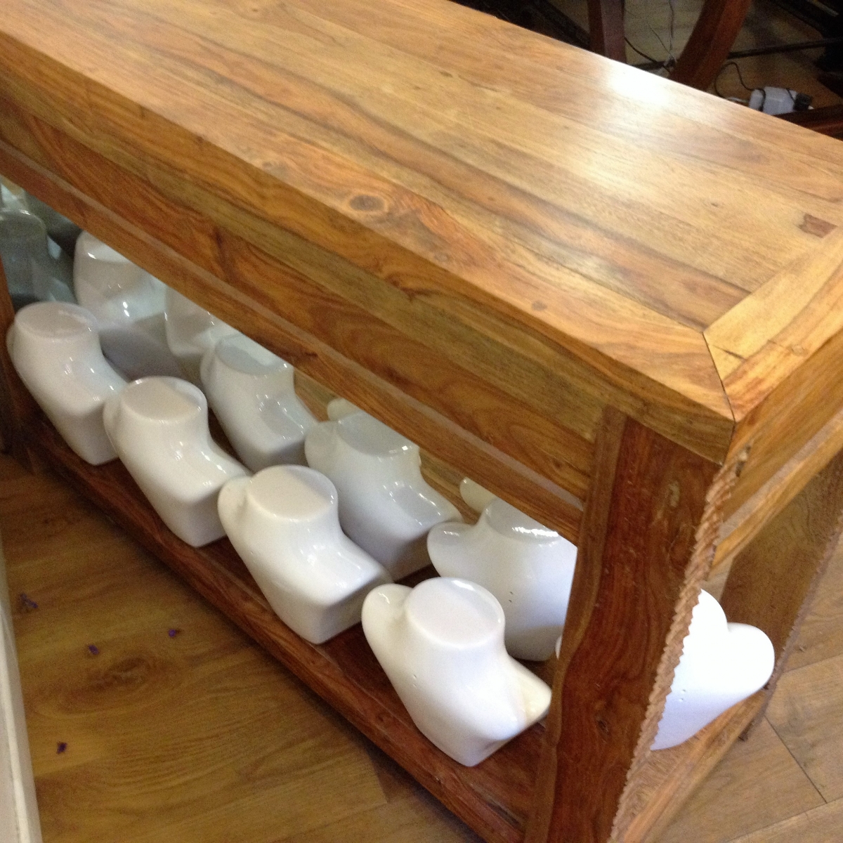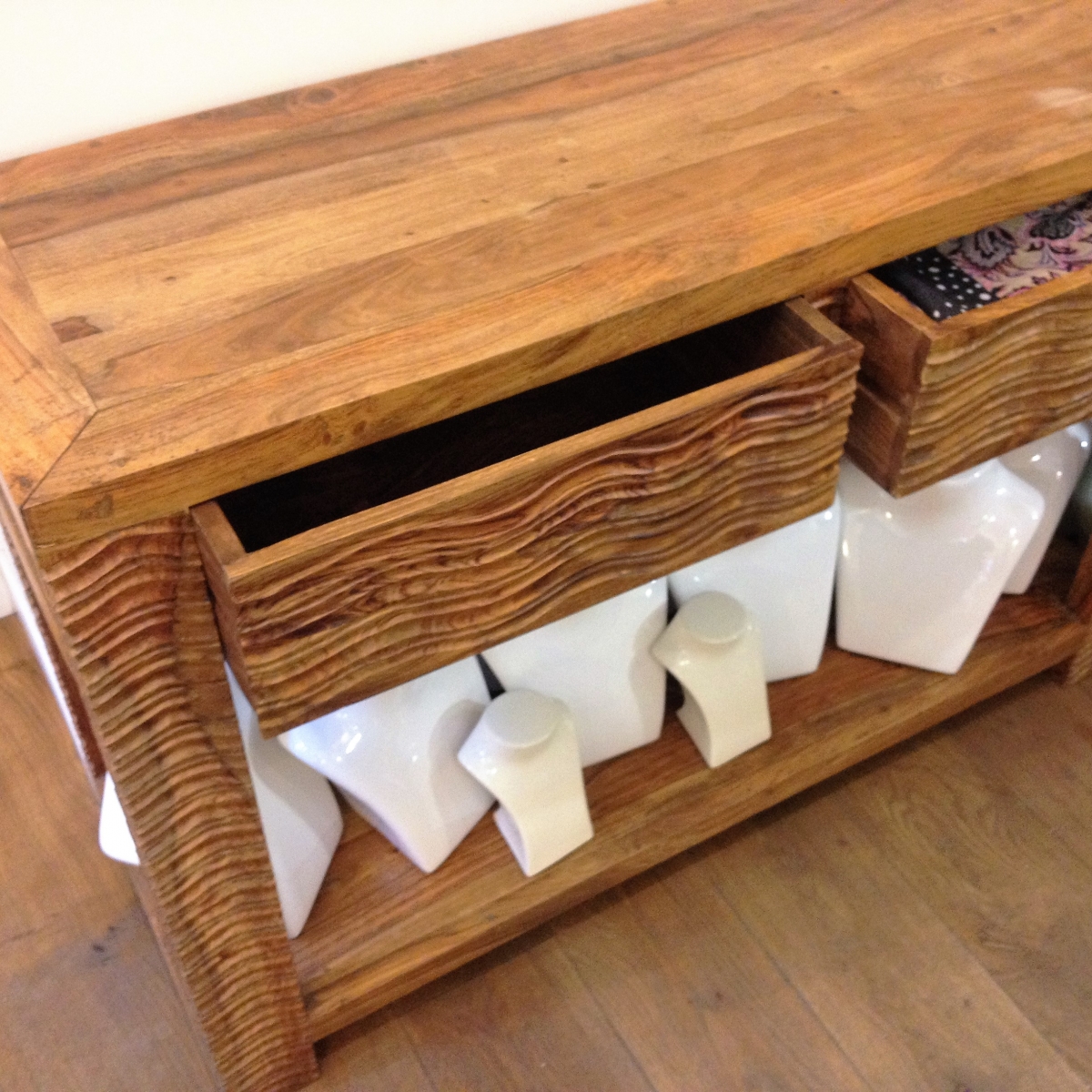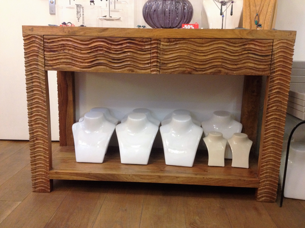 belle console en bois massif, à l'arrière également: peut donc être placée au centre de la pièce.