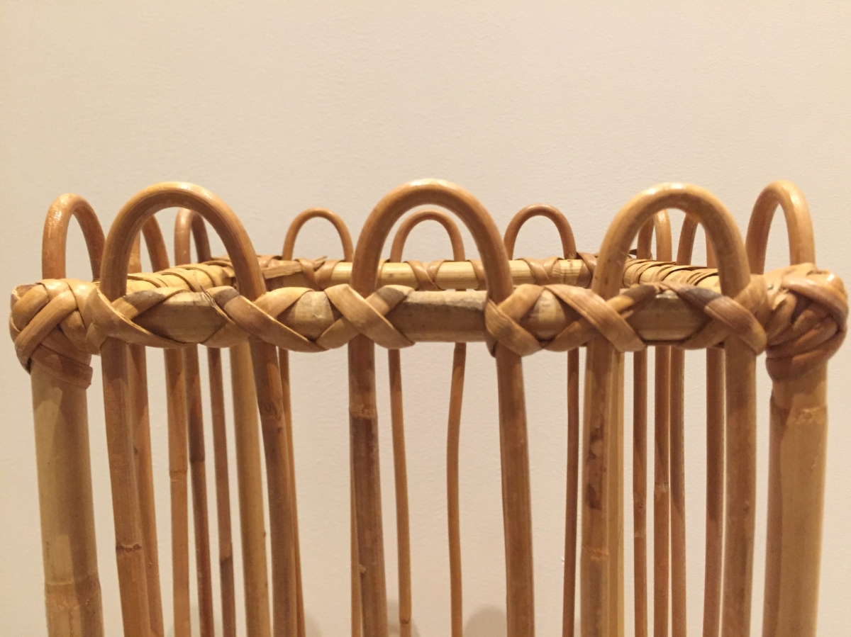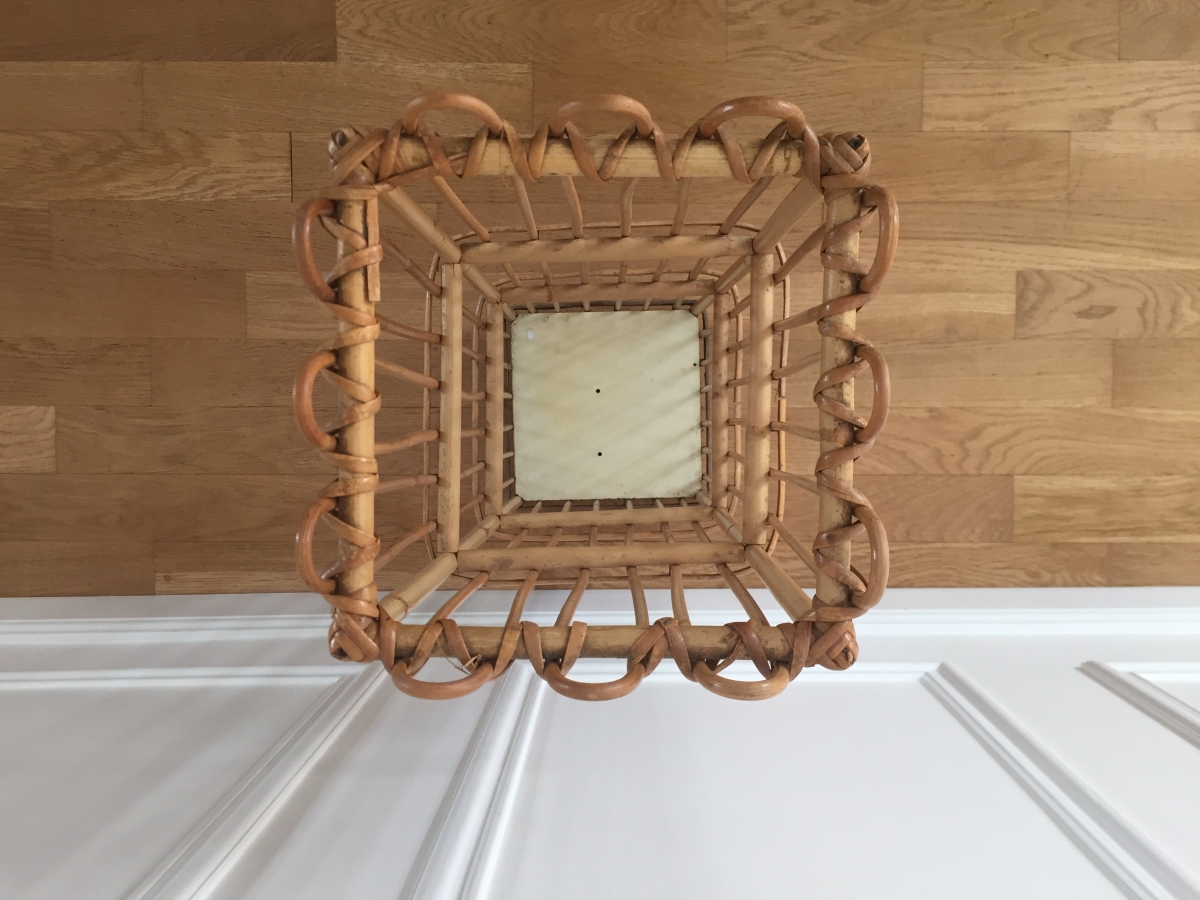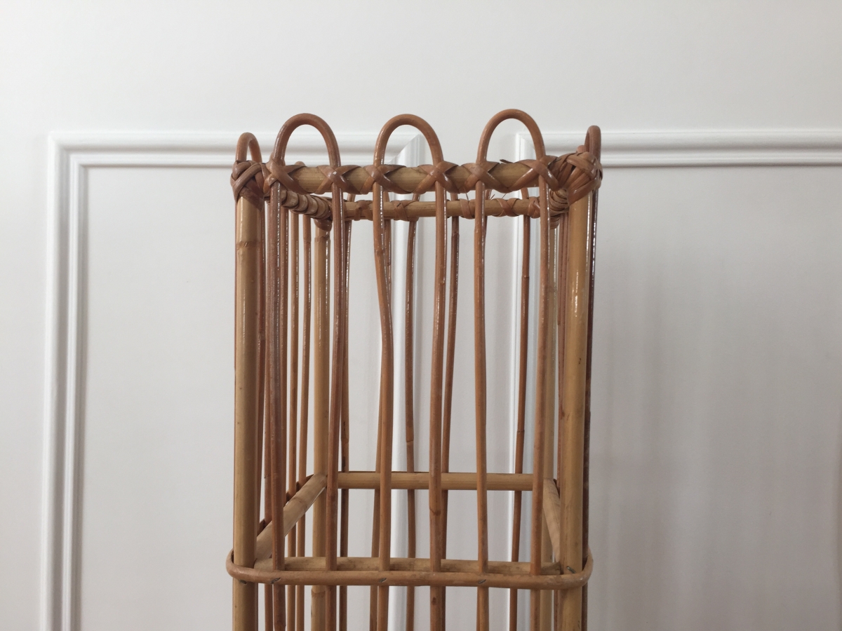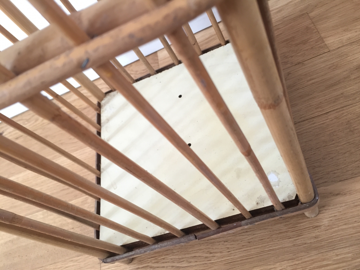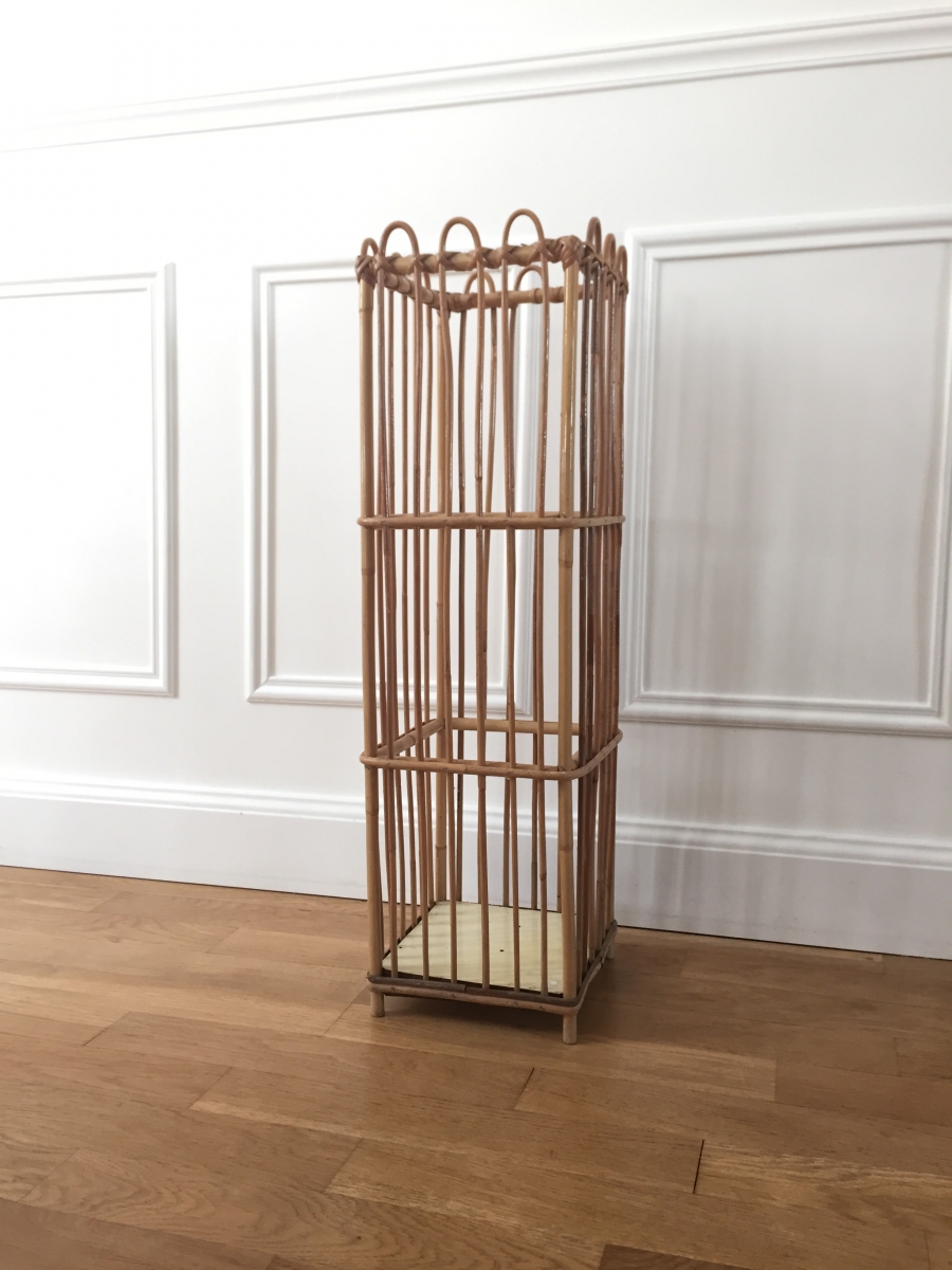 Jolie huche à pain en rotin, fond formica. Elle pourra tout aussi bien faire office de porte-parapluies ou de coffre à doudous. A noter: le fond a une tâche que l’on voit sur la deuxième photographie.