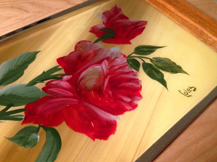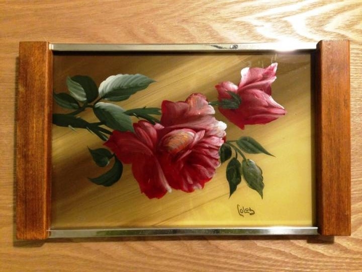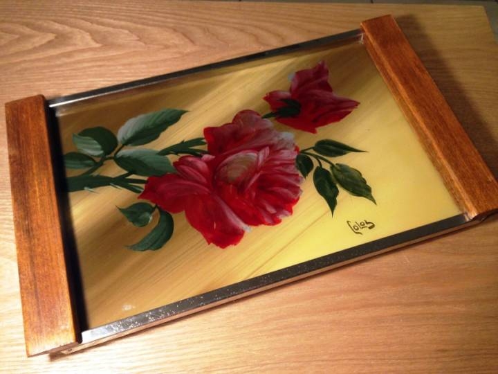 Plateau de service Bois et verre peint à la main motif roses années 40-50