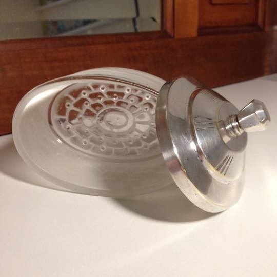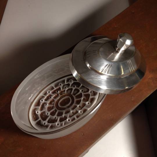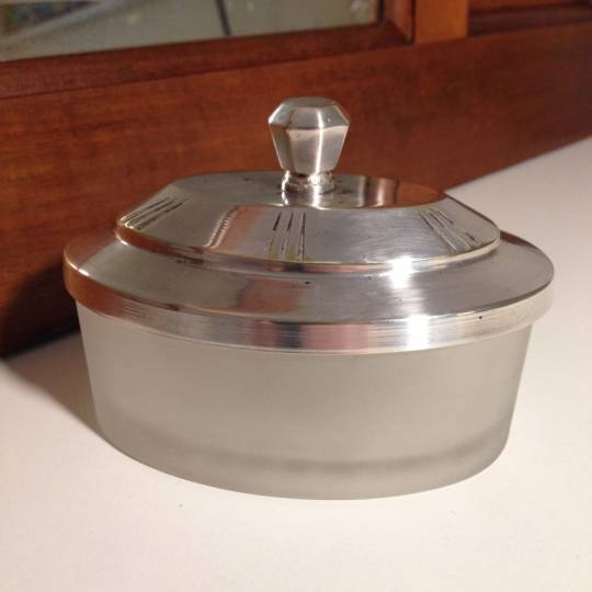 Couvercle en métal argenté sobre avec quelques lignes géométriques et bouton sculpté.