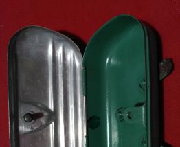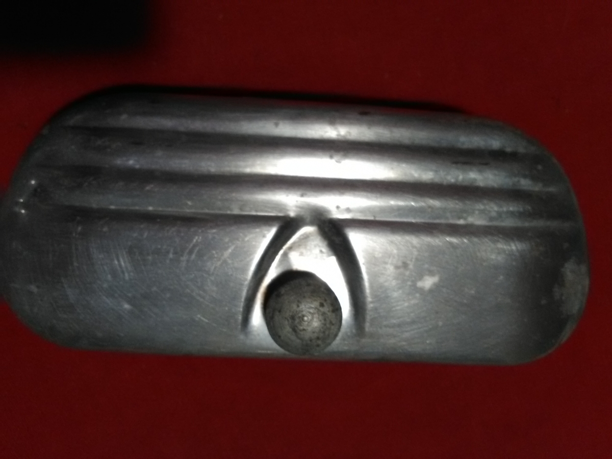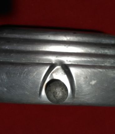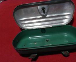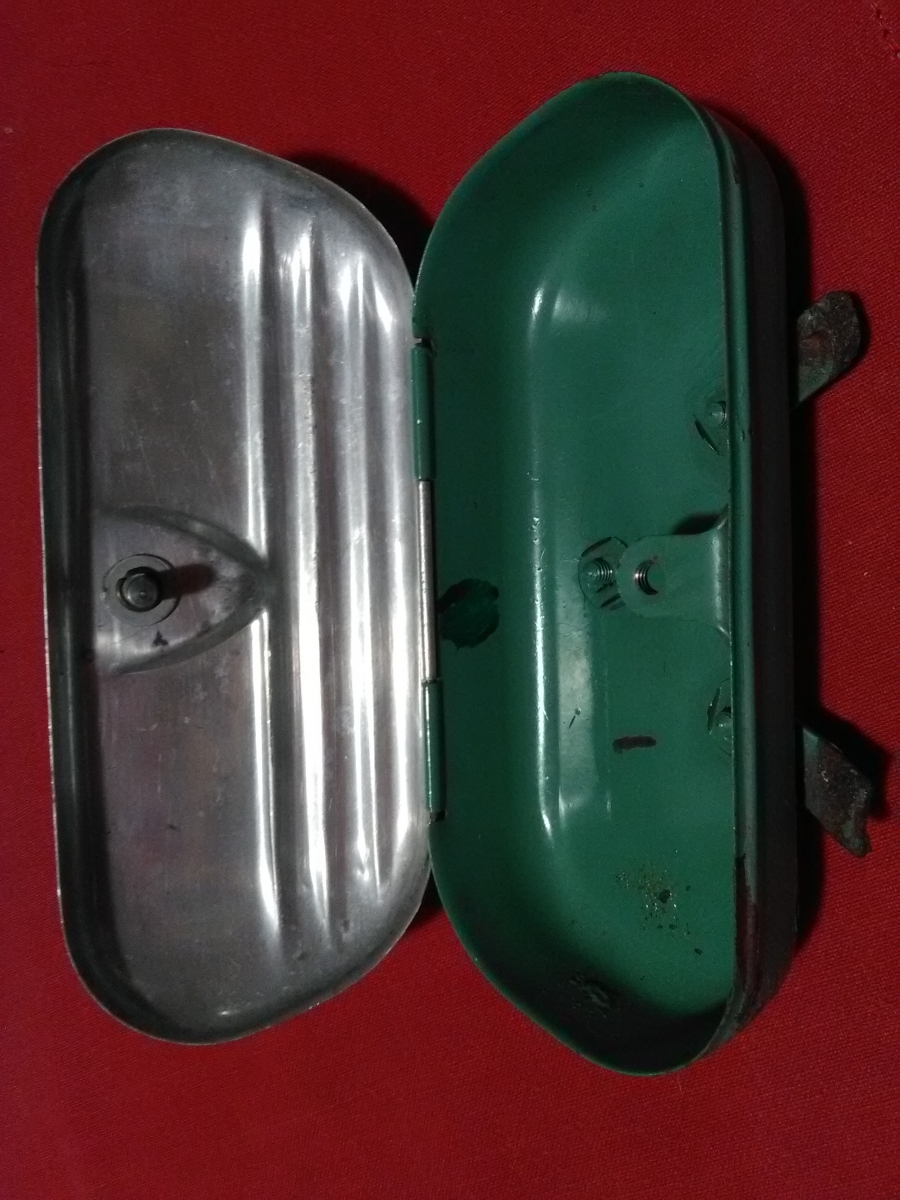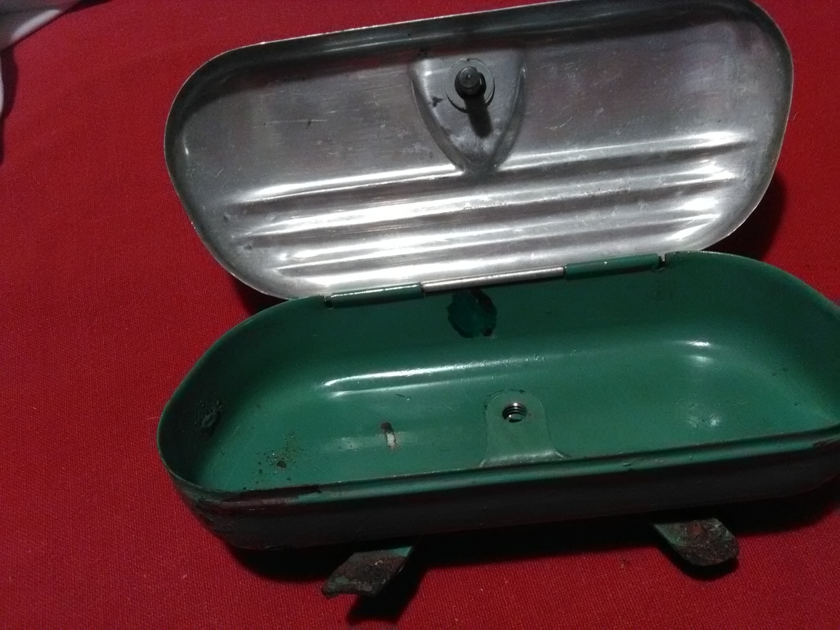 Boite à outils ancienne de vélo à fixer sous la selle. Métal. Couvercle à vis en aluminium. Couvercle et intérieur en très bon état. Fond extérieur rouillé. Longueur 17 cms largeur 7 cms. A retirer à la Roche sur Yon ou St Gilles croix de Vie . Me consulter pour envoi en France.