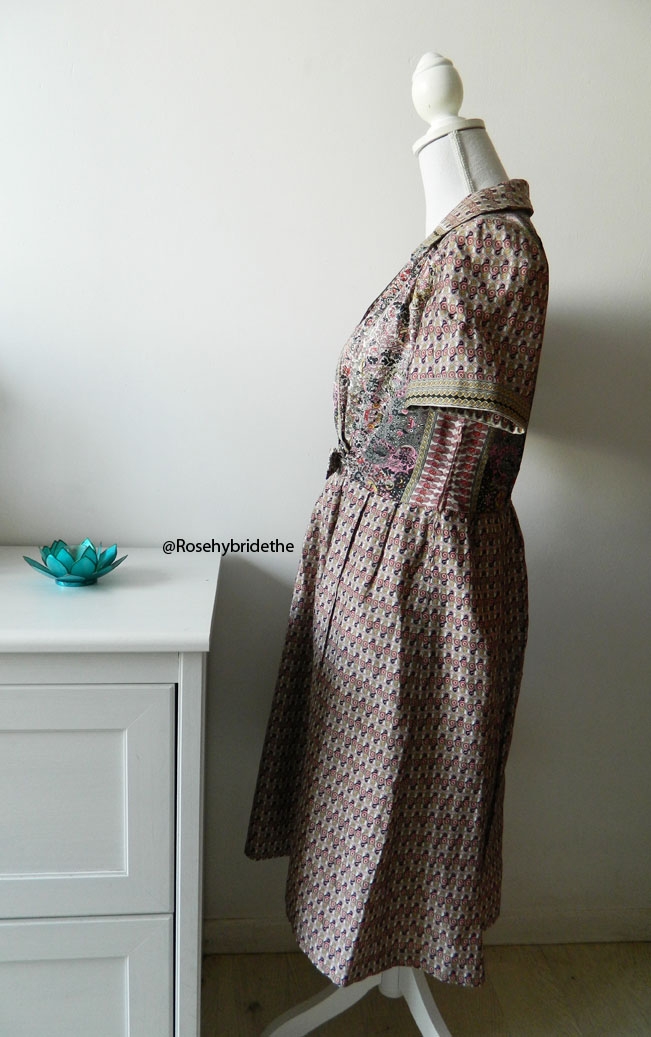 La robe est cousue main dans une matière satinée et légère, comme de la soie (il ne s'agit pas de soie, le tissu a passé le test du feu et une odeur synthétique s'en dégage : je pense que c'est de la rayonne, matière très utilisée pendant les 40's).