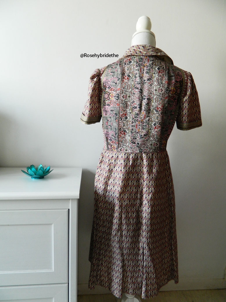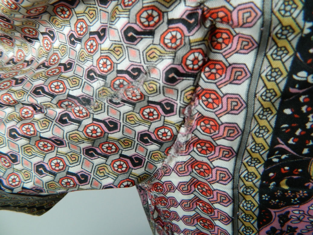 Attention : la robe a vécu. Elle fête ses 70 bougies (voir plus) !!!! Quelques déchirures sur les deux manches ont été recousues/recollées (voir photo 4). Elles passent finalement incognito une fois la robe portée.