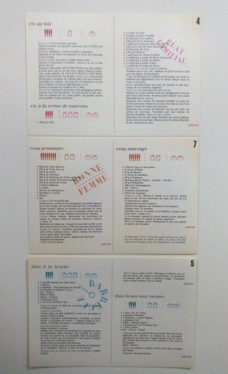 Le classeur en 3 volets comprend 210 fiches de recettes (imprimées en recto verso). Les fiches sont plastifiées donc lavables et réparties en 9 catégories : Hors d'oeuvre, Potages, Légumes, Poissons, Volaille, Gibier, Viande, Oeufs et Desserts.
