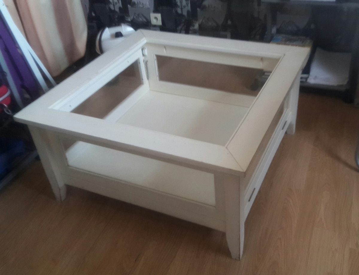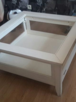 Table basse blanche plateau en verre .