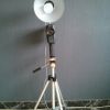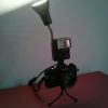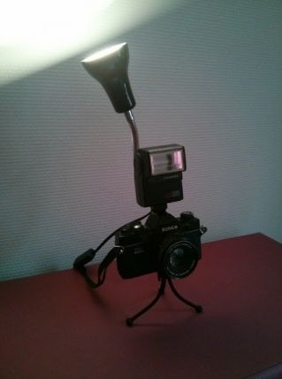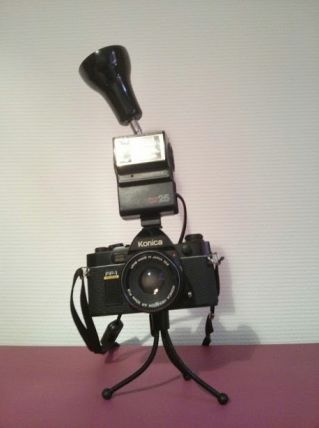 Lampe réalisée avec un ancien appareil photo Konica des années 1980 chiné dans un vide grenier, la lampe est réhaussée d'un flash Hanimex de la meme période et un mini trépié sert de pied.