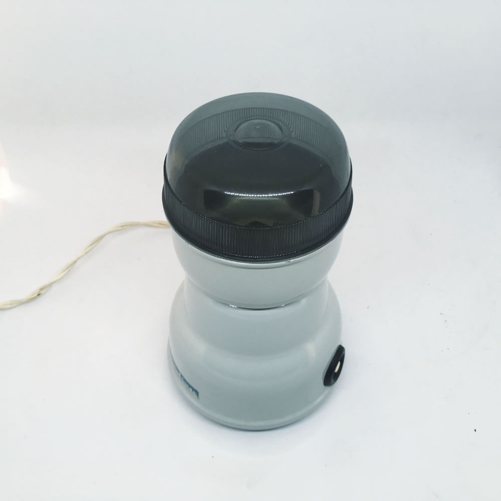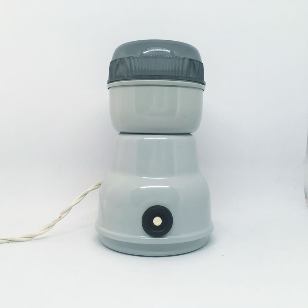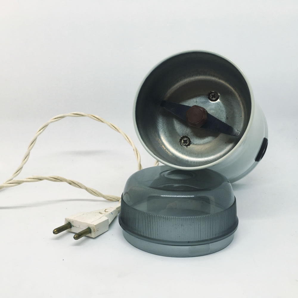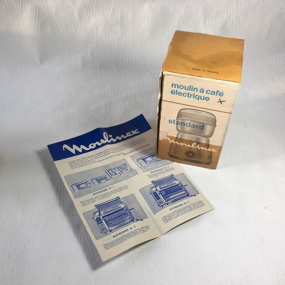 La version 1960 de l'emblématique moulin à café Moulinex dessiné par l'ingénieur Roger Georges (également auteur du logo de la marque). Exemplaire fonctionnel, en très bon état, avec boîte d'origine et dépliant publicitaire.