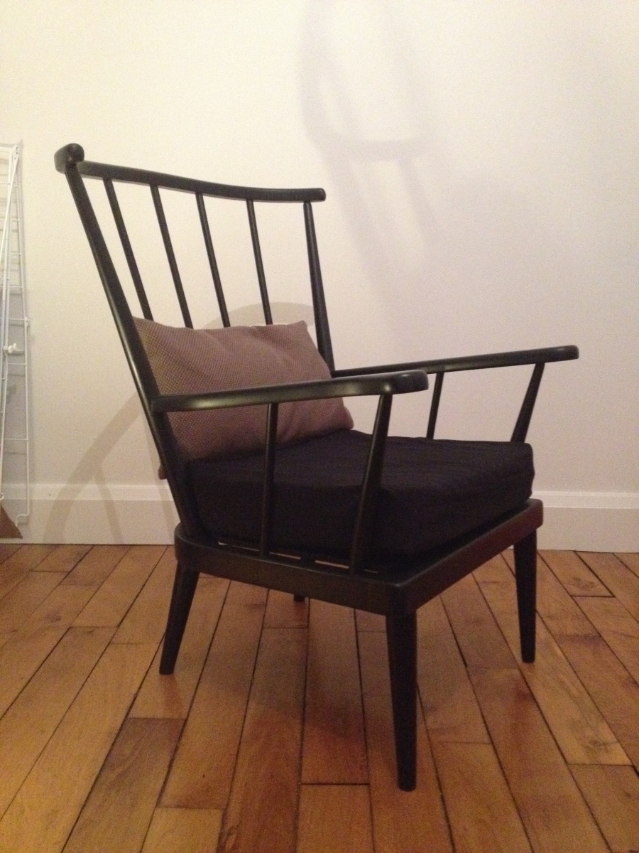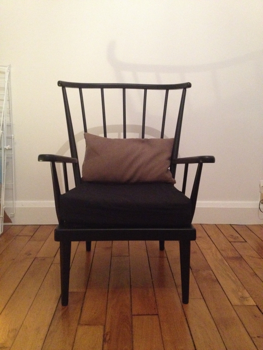 Fauteuil Baumann noir. Bon état, l'assise est une planche noir faite sur mesure.