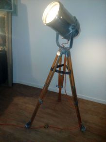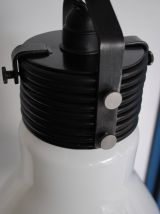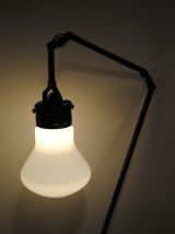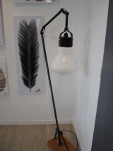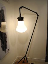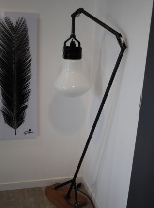 Création les Retrochineurs , quand le vintage rencontre l'industriel ...... Unique lampadaire crée de toute pièce a partir d'une opaline en forme d'ampoule des années 70 . Structure métal patine grise , câble tissus gris avec douille e27 (ampoule led fournit) . Pied Bois vernis.Poulies céramique d'époque passe câble.