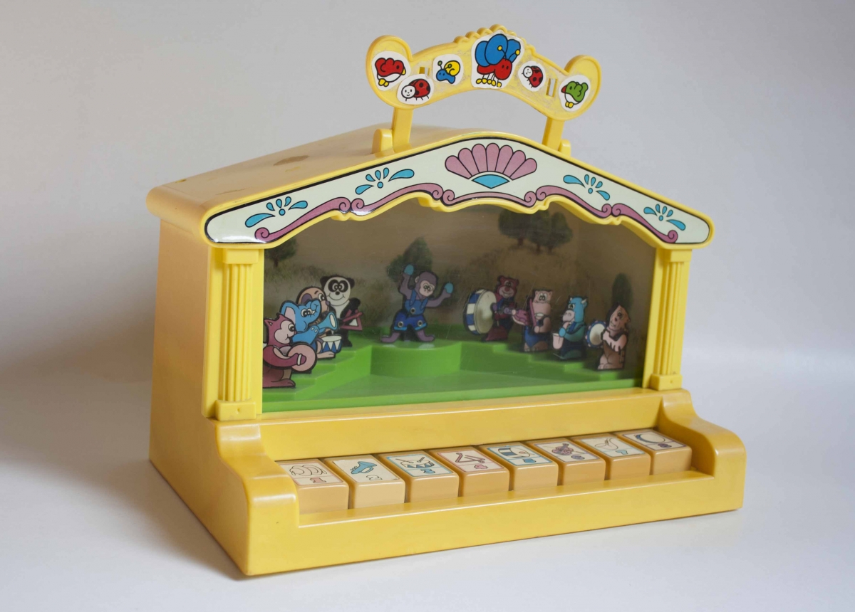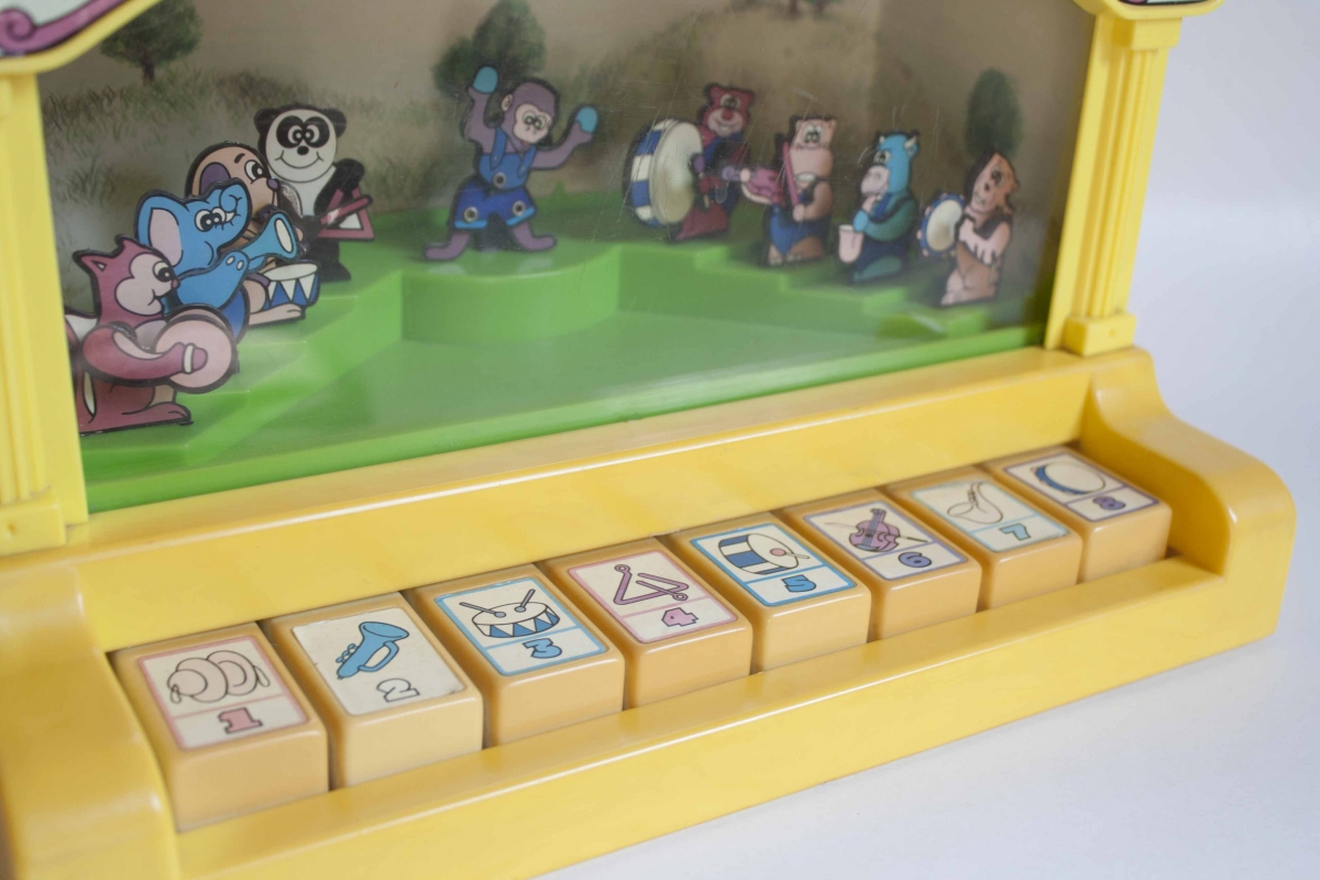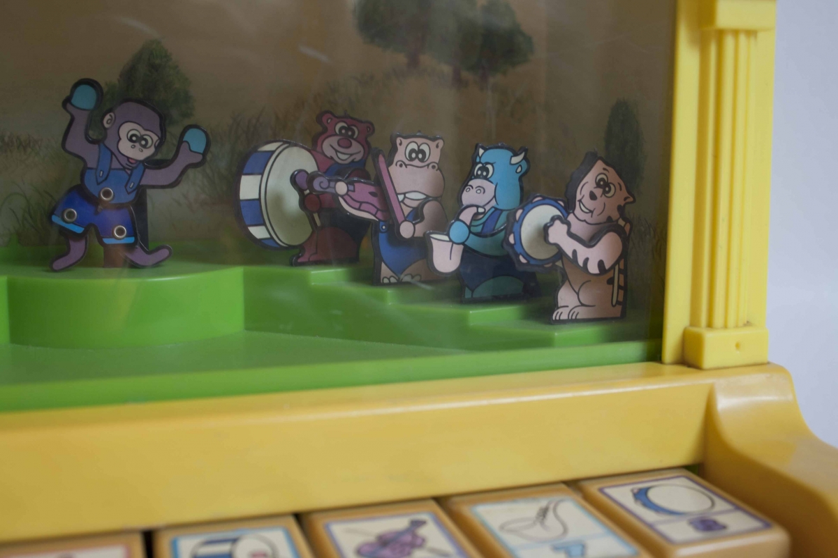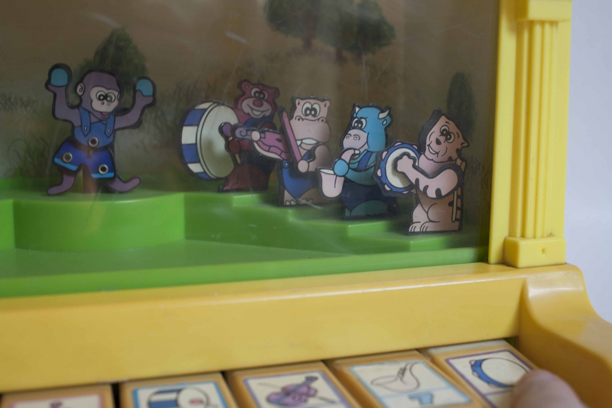 chaque touche du clavier produit un son et est relié à l'animal qui se trouve en face et au chef d'orchestre, l'animal articulé bouge son instrument de musique dès qu'on appuie sur une touche