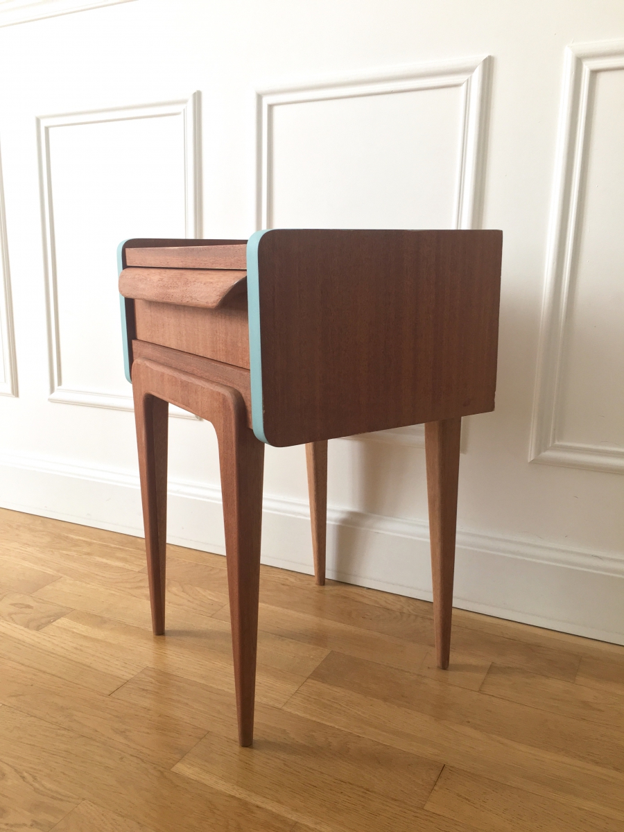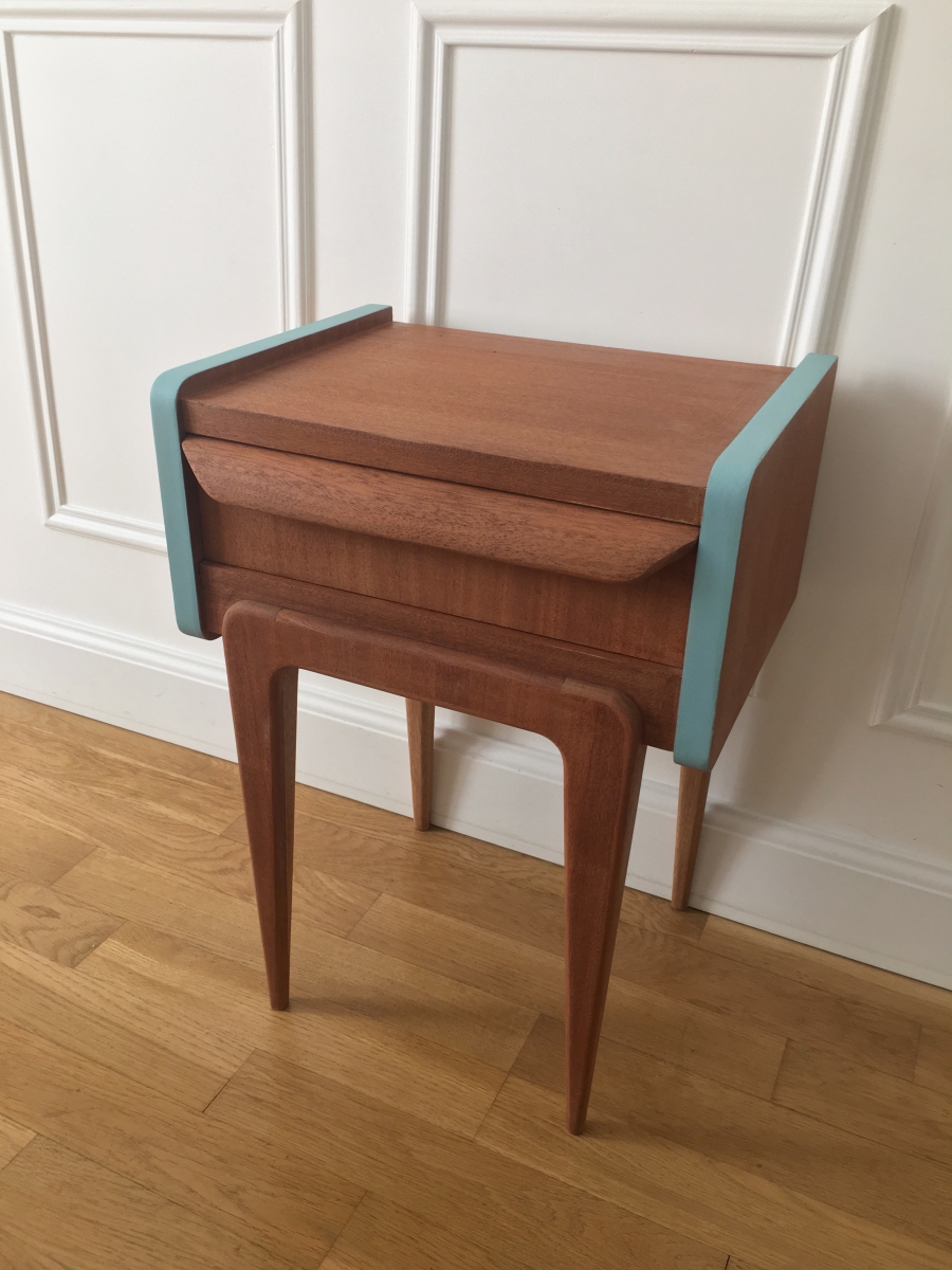 Doté de grands pieds fuseaux, d’une ligne parfaite, il s’agit d’une très belle pièce de mobilier. Pratique avec son tiroir, il pourra tout aussi bien servir de bout de canapé ou de petit meuble d’entrée.