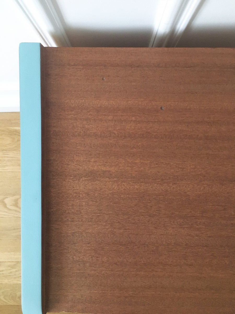 Je l’ai déverni et huilé avec une huile incolore mate écologique (émissions A+). Son chant a été peint en Bleu Canard pour souligner ses lignes courbes.