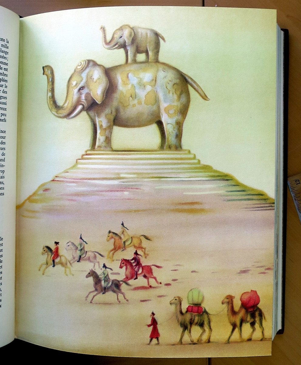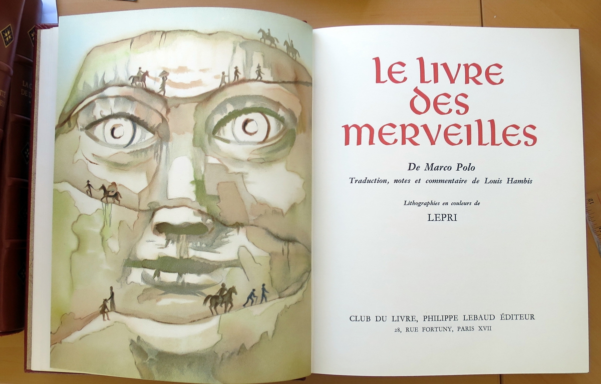 Illust. de Lithographies, en hors Texte couleur, par LEPRI (). ] - POLO, Marco. & LEPRI. Le Livre des Merveilles. Traduction, notes et commentaires de Louis Hambis. Paris, Ed. Club du Livre, 1977, en 1 Vol. In-quarto (26/30 cm). Pleine Reliure Cuir, plat estampé et gauffré sous emboitage, Dos à faux nerfs orné de motifs et titre dorés. Tête dorée, signet et tranchefile. 295 pp. Edition numérotée sur Papier Velin de Lana.