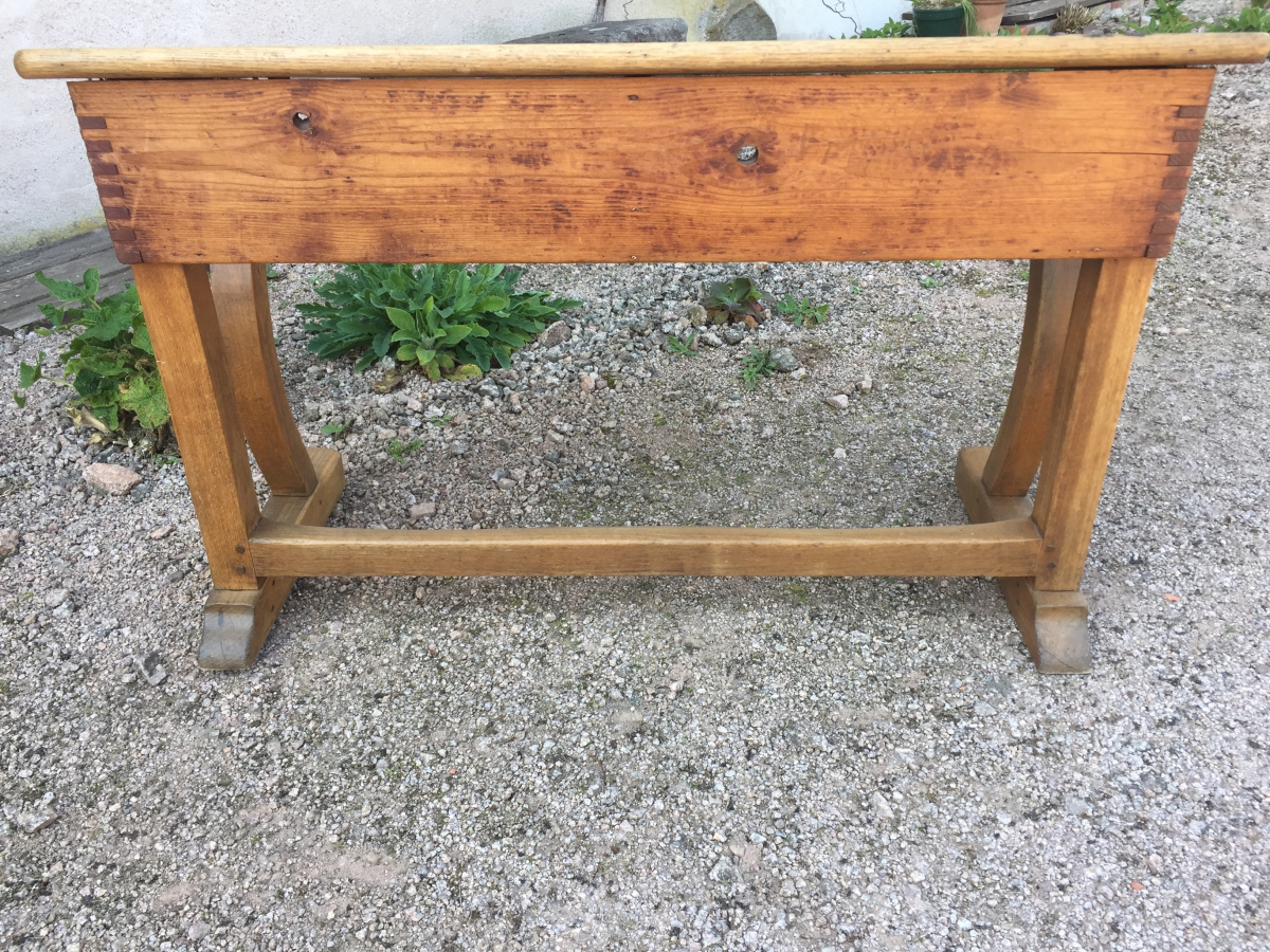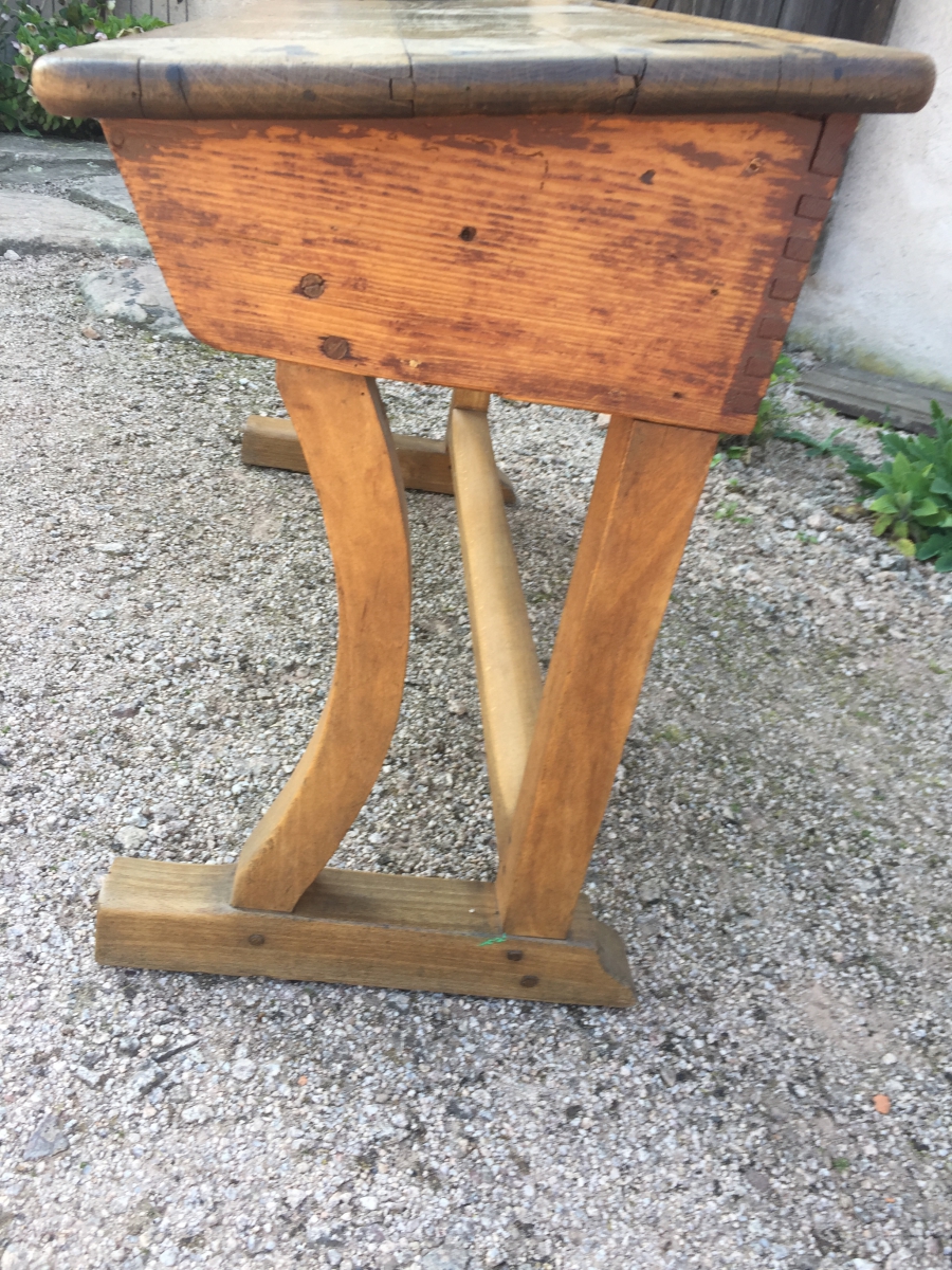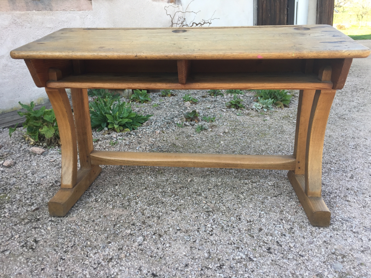 Pupitre ancien 2 places pour jeunes enfants avec casiers, encriers et rainures à crayons. Plan incliné. De facture robuste en chêne avec chevilles, tenons et mortaises.