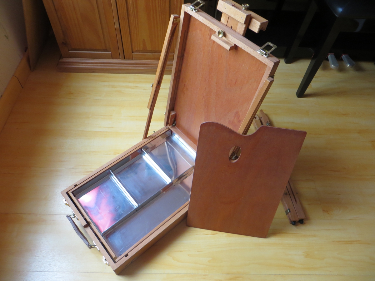 Chevalet-coffret pour dessiner, peindre, pliable pour un gain de place, avec compartiment de rangement intérieur. Très bien état, peu servi.
