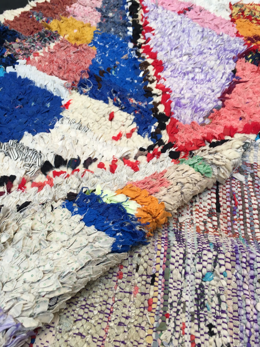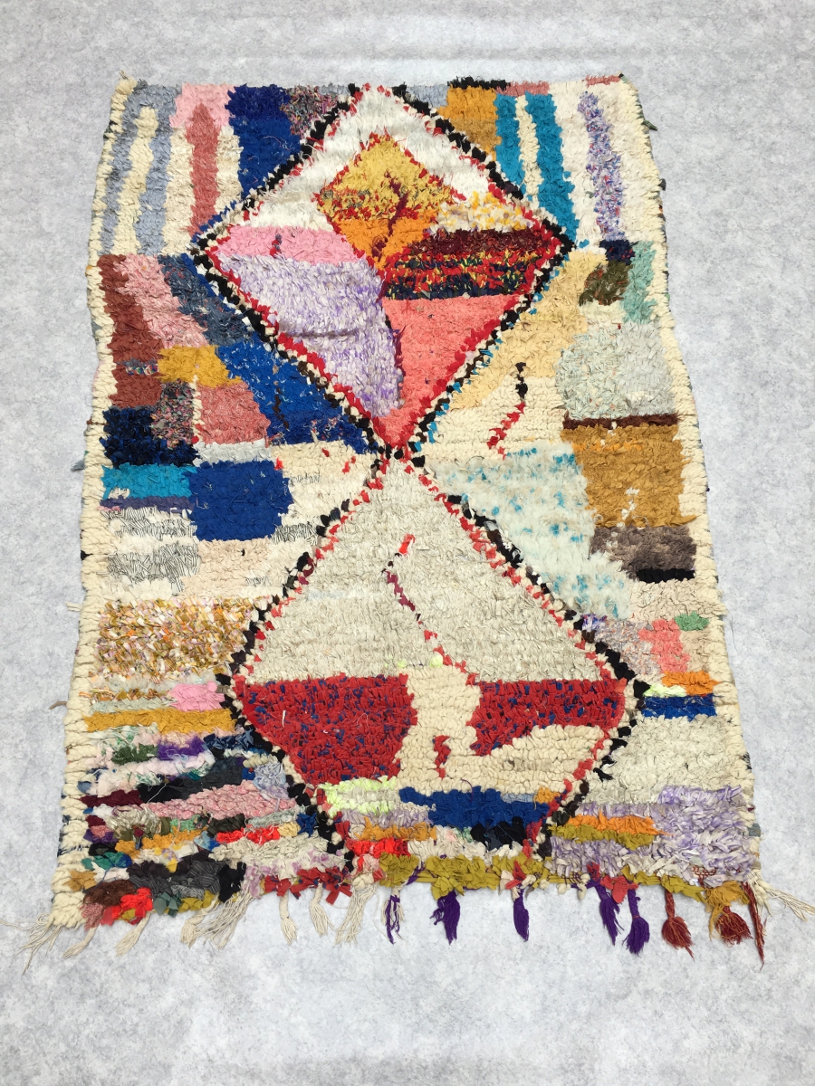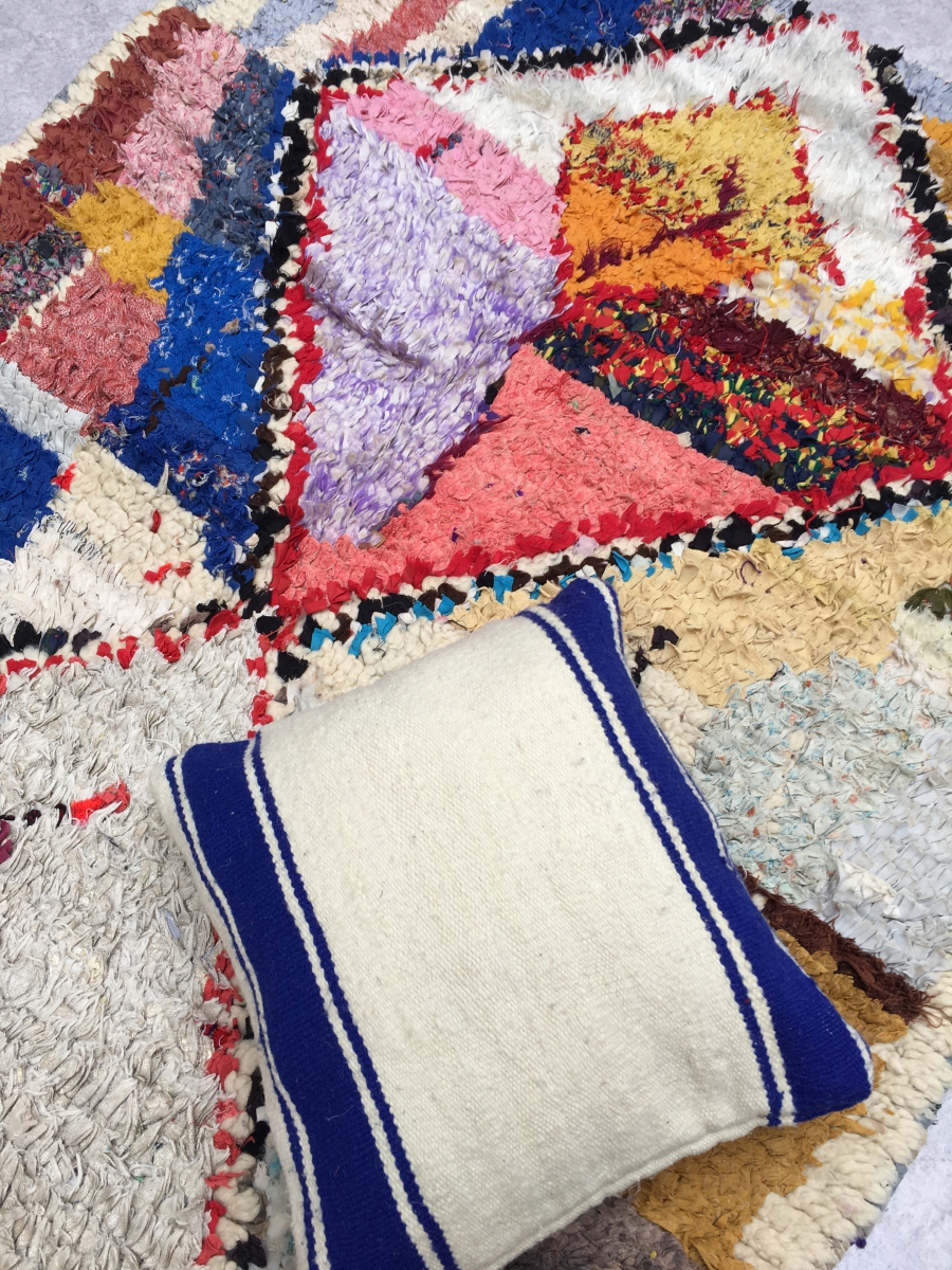 Ce tapis est fait main, à base de Laine et de chutes de tissues colorés. Il a été noué au Maroc. D'inspiration ethnique, il viendra apporter un touche tendance et vintage à votre pièce à vivre .