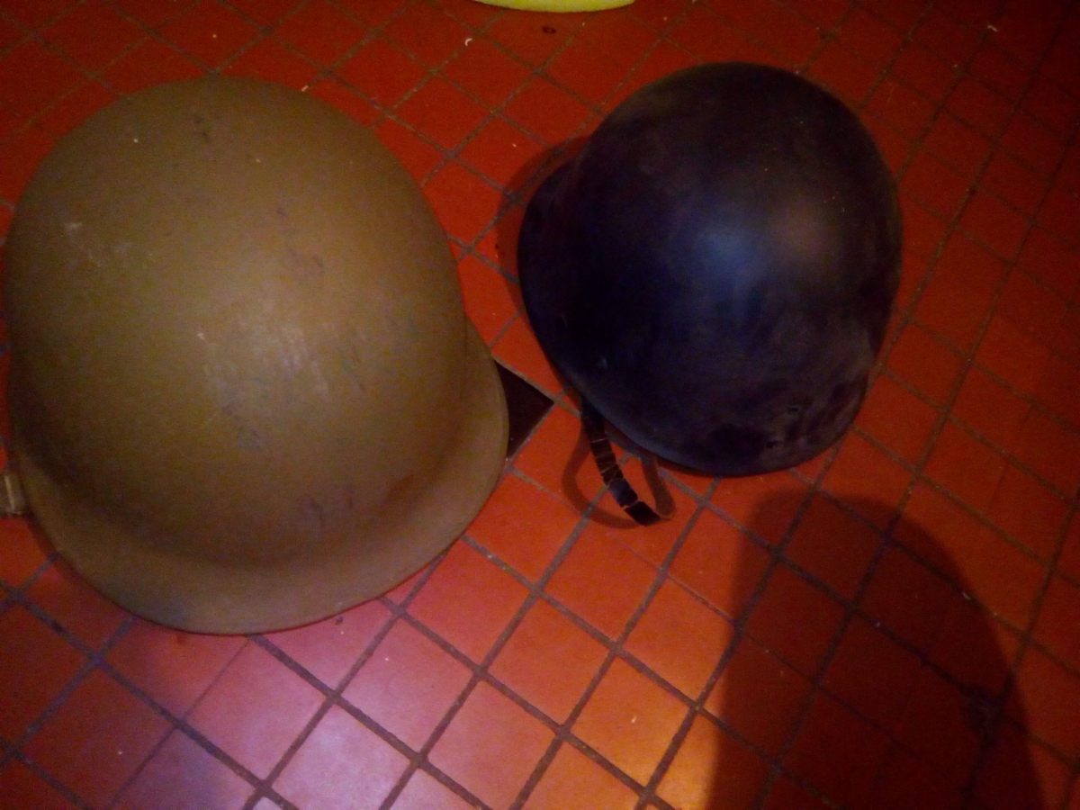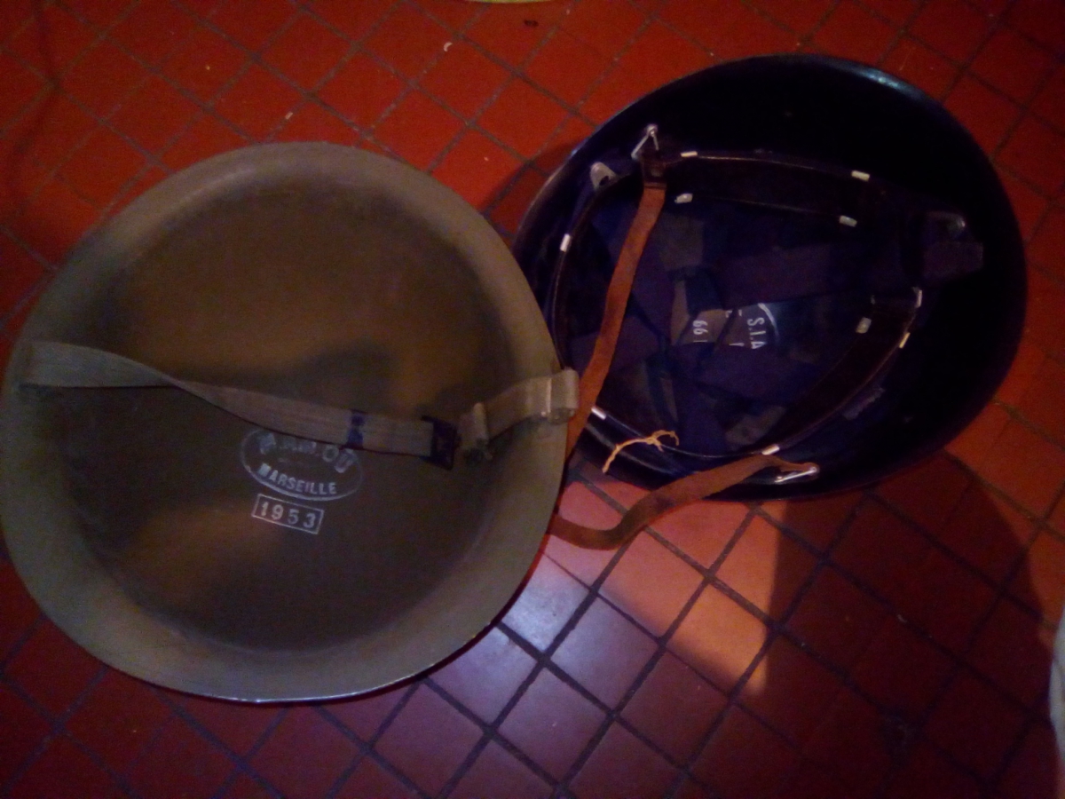 Casque de gerre M.AM.OU.ancien année 1953 Marseille.metal et un en plastique bleu marqué S.i.a le Mans 66r en parfait état.