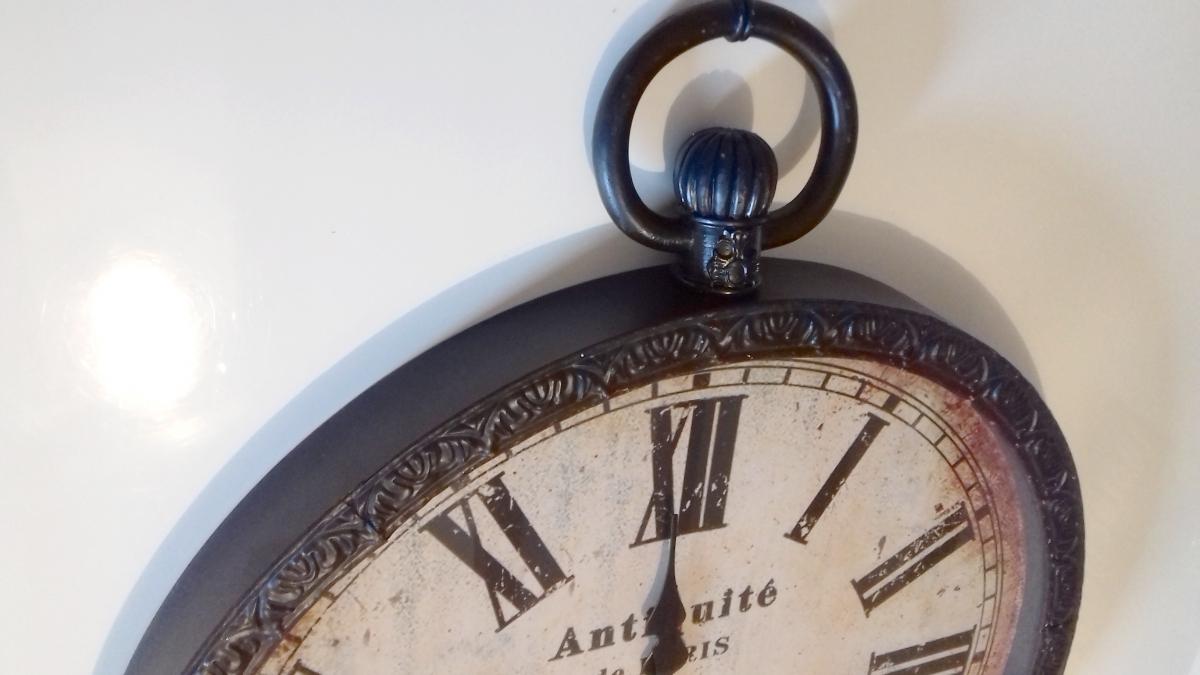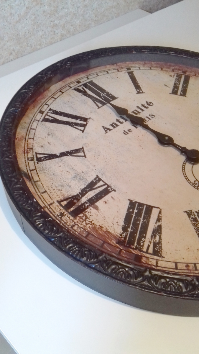 Cette horloge vintage estampillée "Antiquité de Paris" est en métal noir et marron d'aspect vieilli.