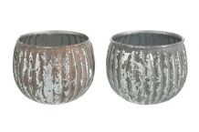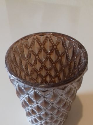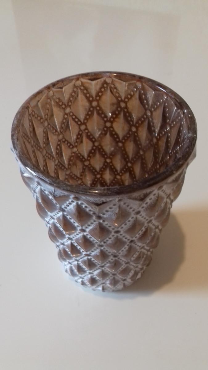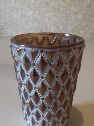 Photophore en carreaux de verres de couleur cuivrés aspect brillants. Les lignes de peinture blanche sont posées sur les contours des losanges afin de les faire ressortir.