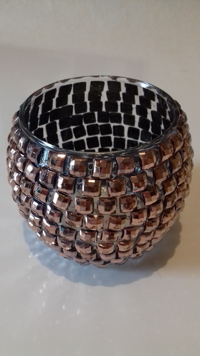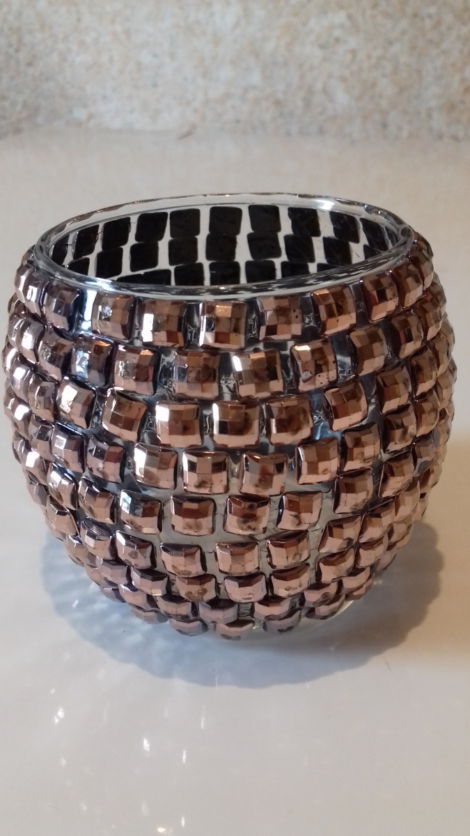 Photophore rond en verre transparent recouvert de strass en plastique cuivré collés façon mosaïque.