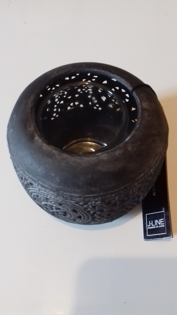 Photophore rond en métal noir d'aspect ancien scuplté façon broderie orientale sur tout son pourtour.