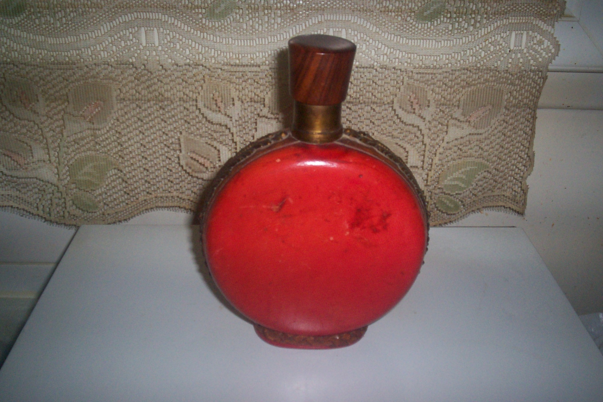 bouteille en verre et recouverte de cuir relief graver pour vos apéro et bar objet d'occasion en très bon état .