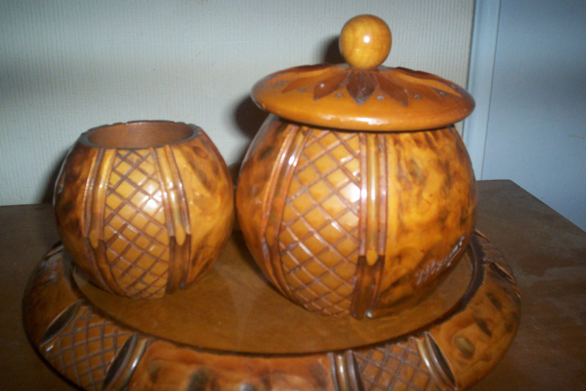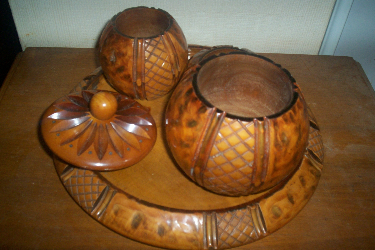 très joli et ancien plateau pour fumeur un pot à tabac un pot a cigaette cendrier et 1 plateau le tout en bois sculpter graver et en très bon état .