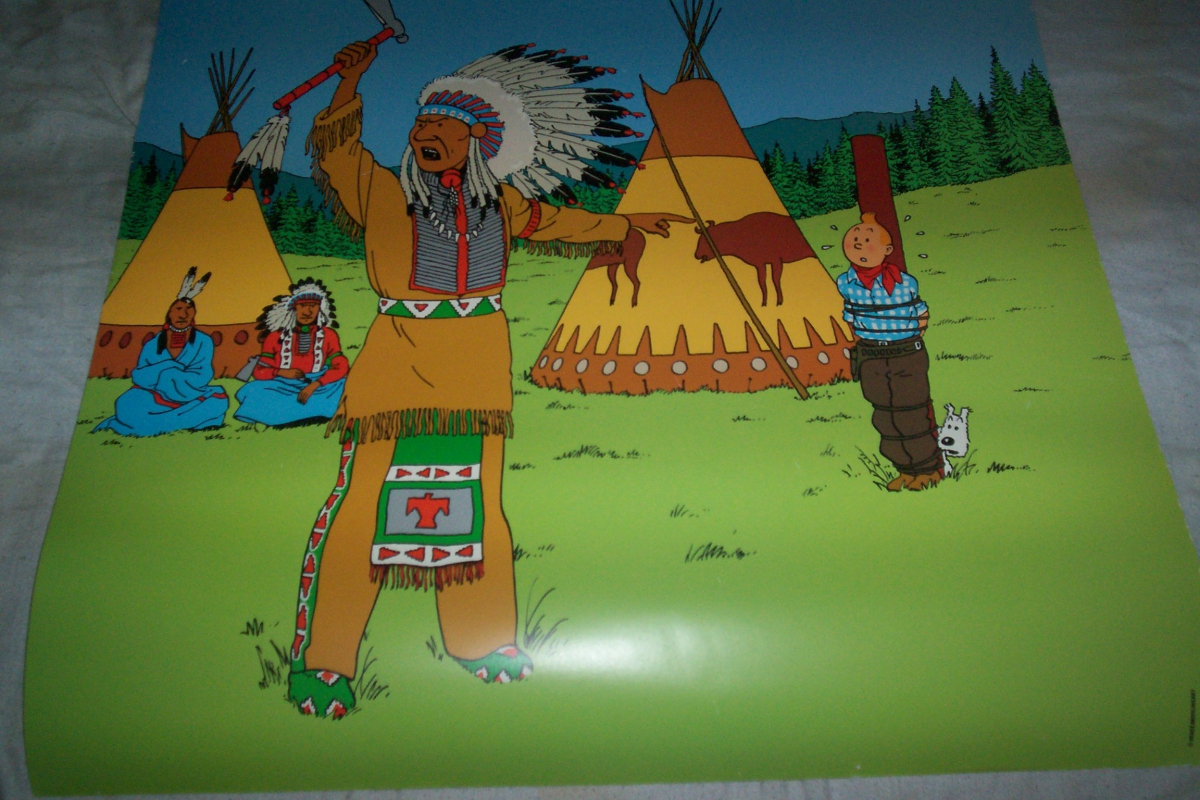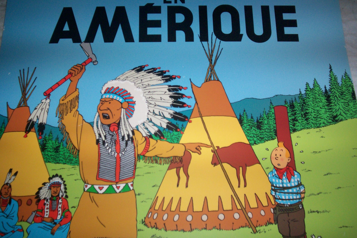grande affiche tintin papier épais plastifié 70 cm par 50 cm tintin en amérique hergé affiche superbe un trou de punaise haut sinon comme neuve . envoi en tube pour protection optimal .
