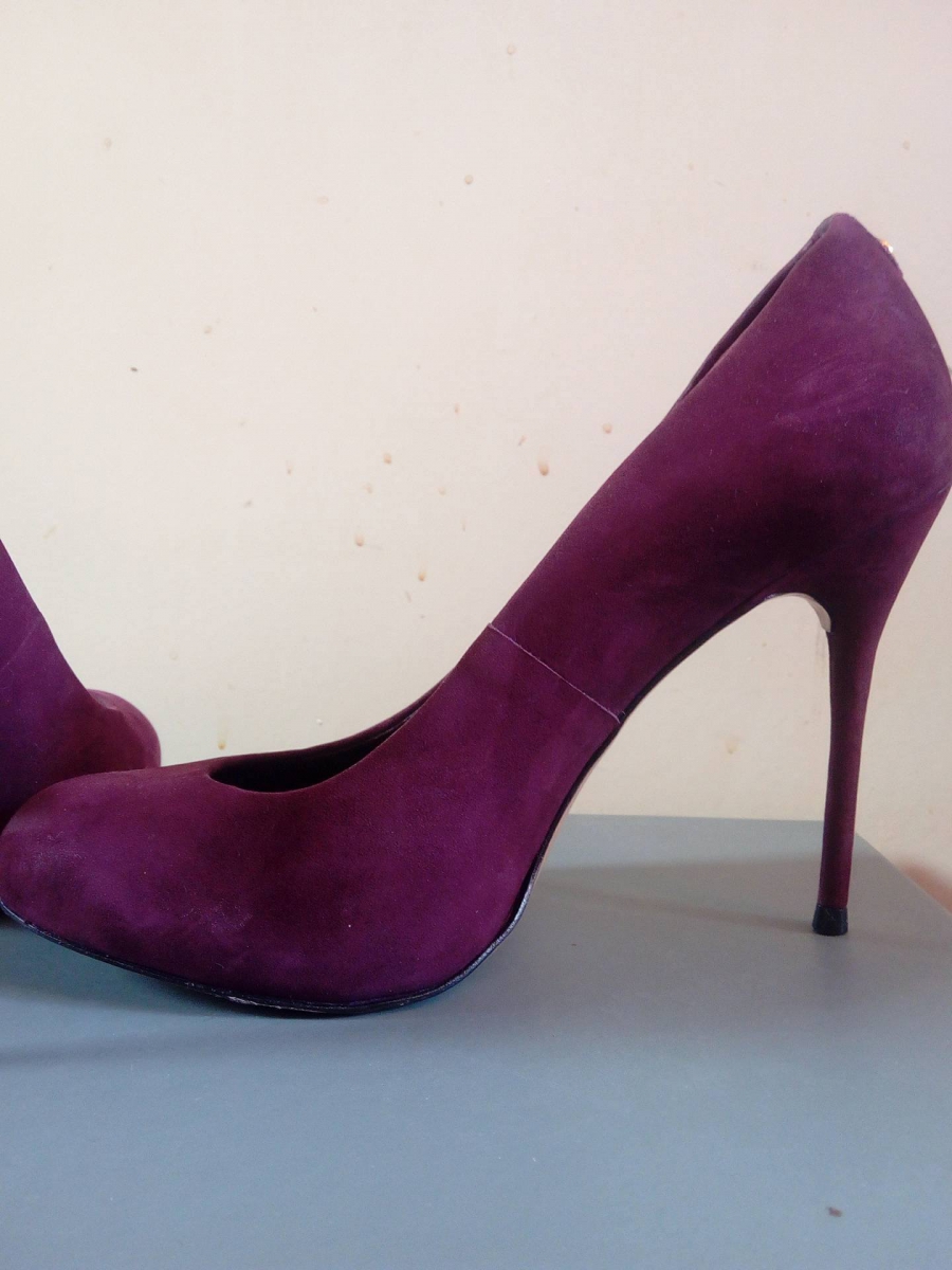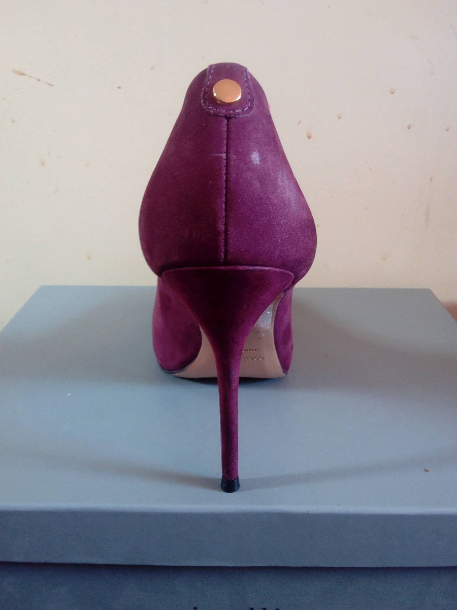 Magnifique escarpin de prestige, en daim bordeaux, talon de 10,5 cm. Porter une fois et cela ce voit sur la chaussure qui est donc neuf. J'ai toujours ça boite en carton l'emballage en papier...