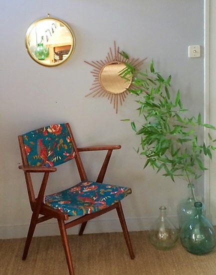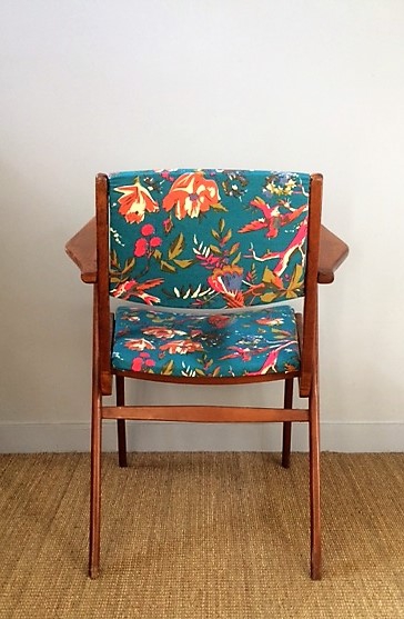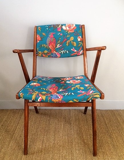 Fauteuil bridge années 60 retapissé avec un tissu esprit vintage mais rendu actuel par ses teintes bleu paon et rose fluo !