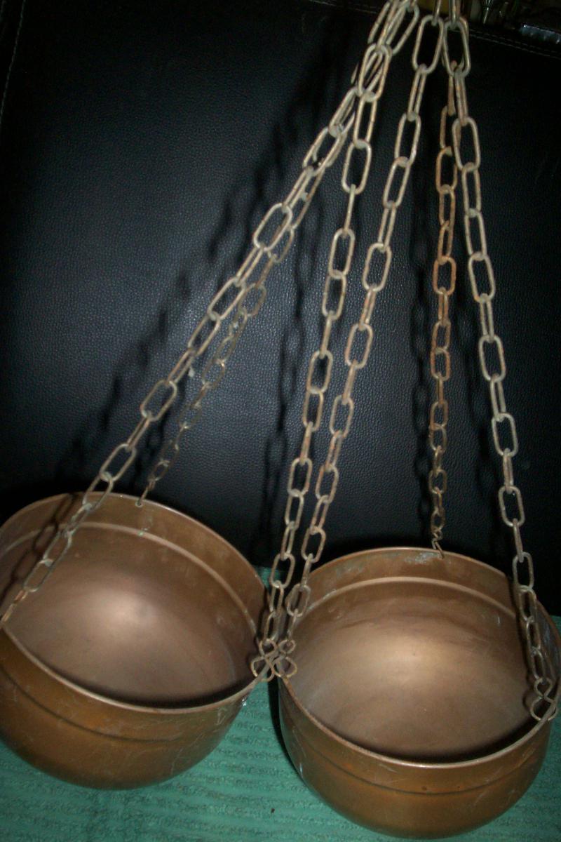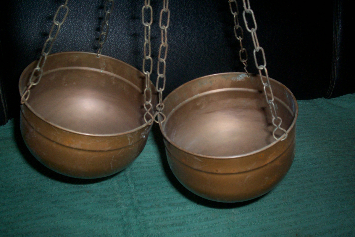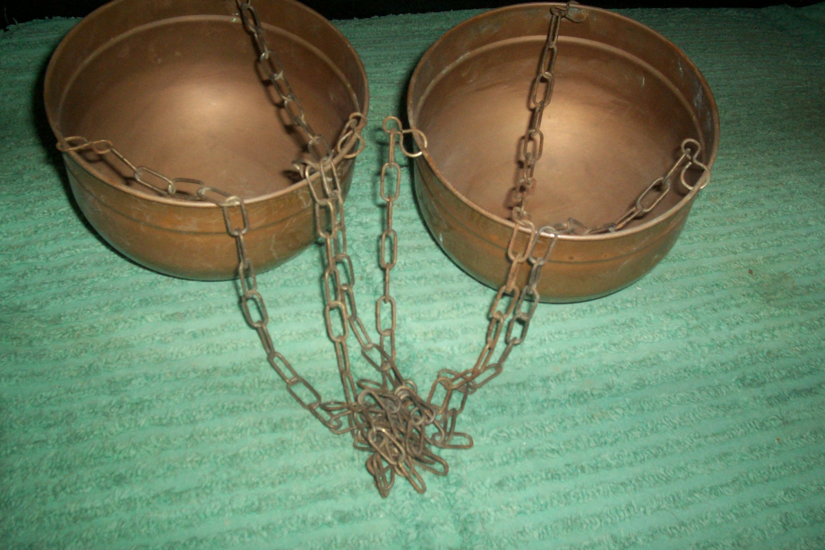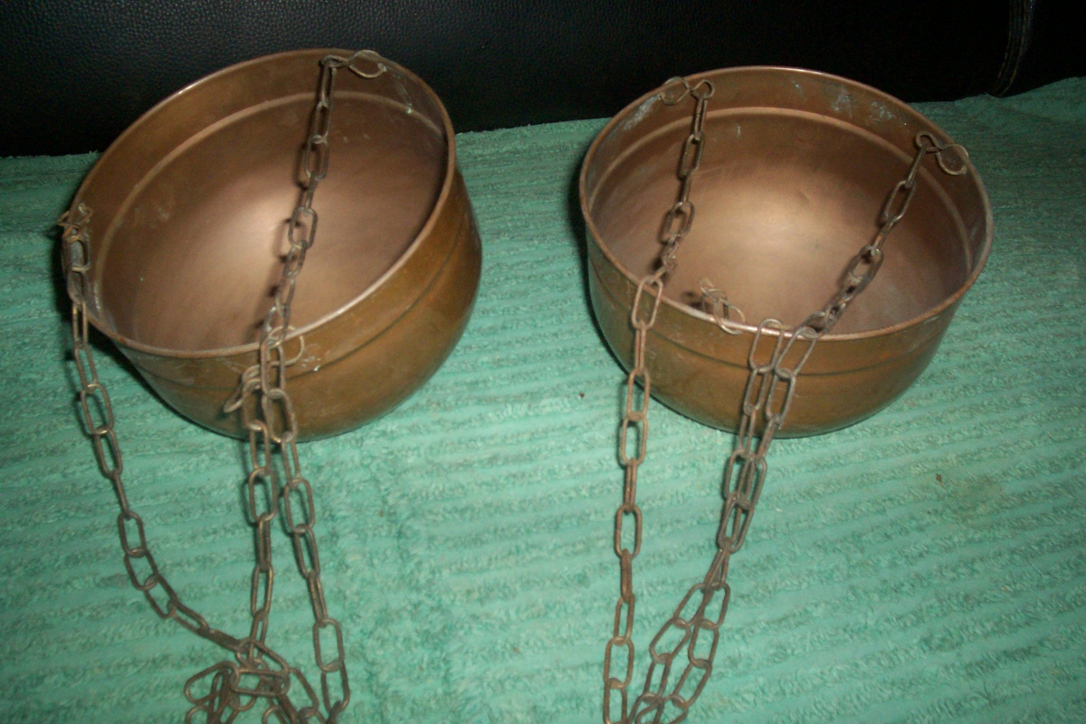 lot de 2 suspensions en cuivre diametre 16,5 cm pour suspendre des fleurs livrer avec chainettes métal ensemble d'occasion en bon état propre .