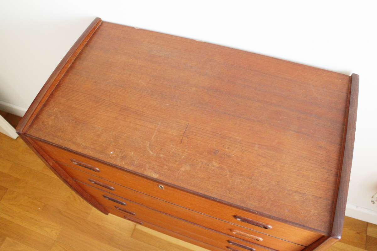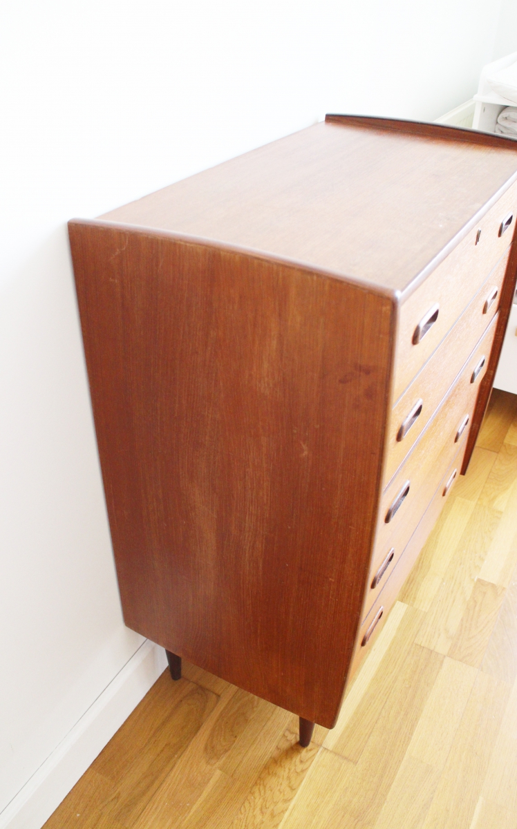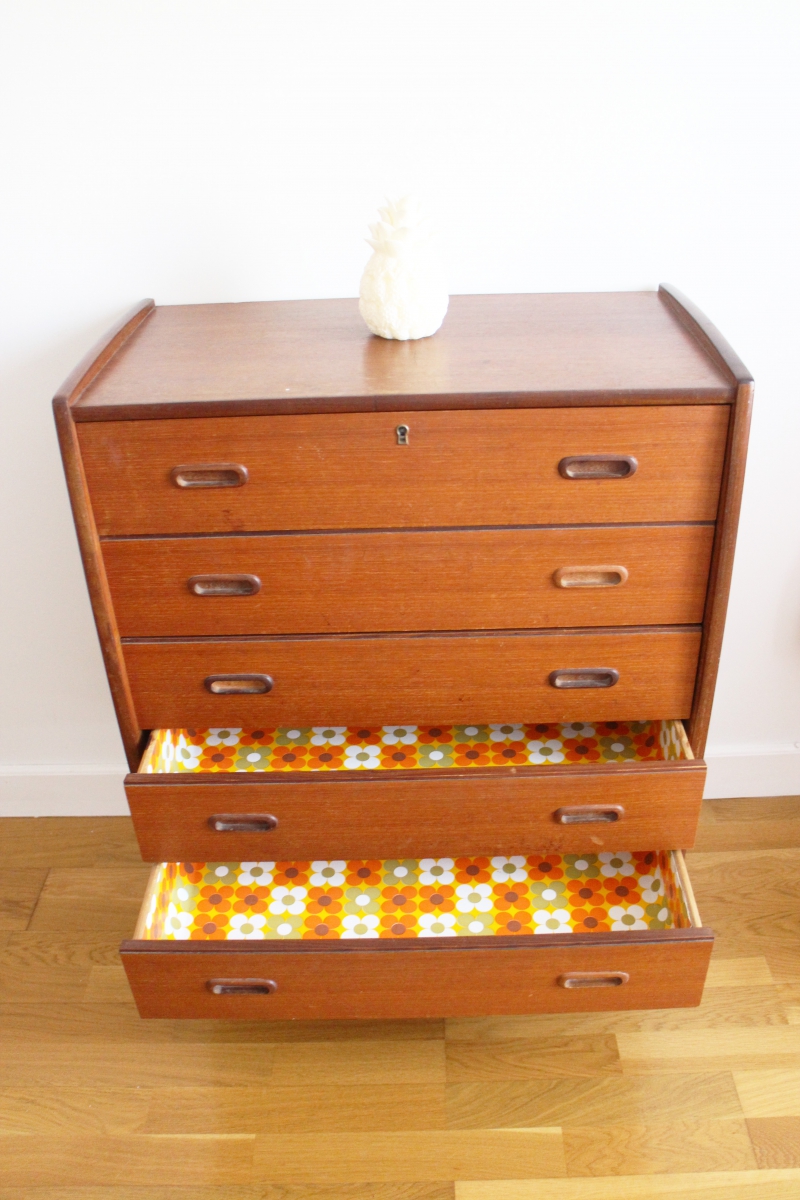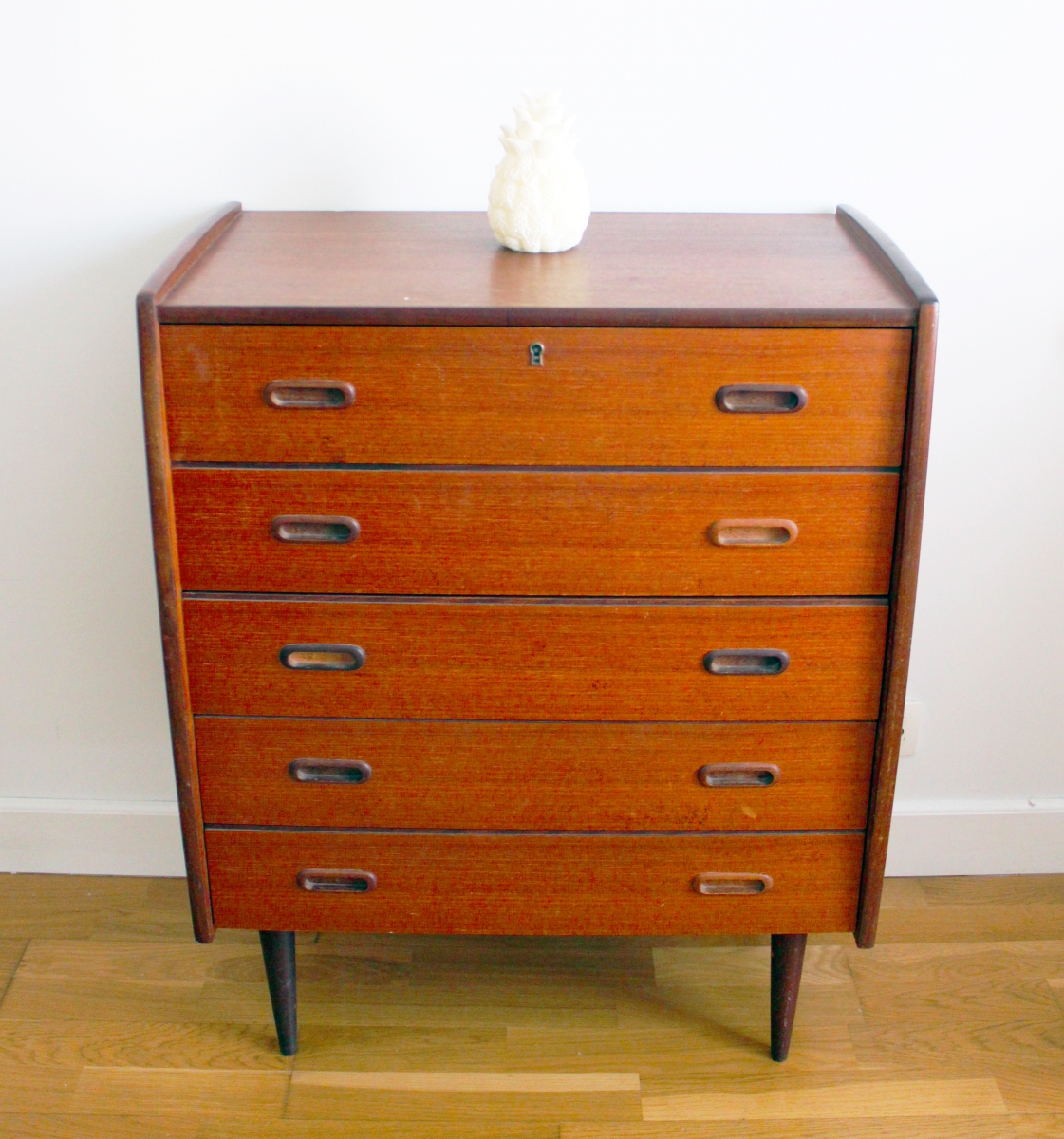 Commode vintage 70's avec ses pieds compas et 5 tiroirs en très bon état .