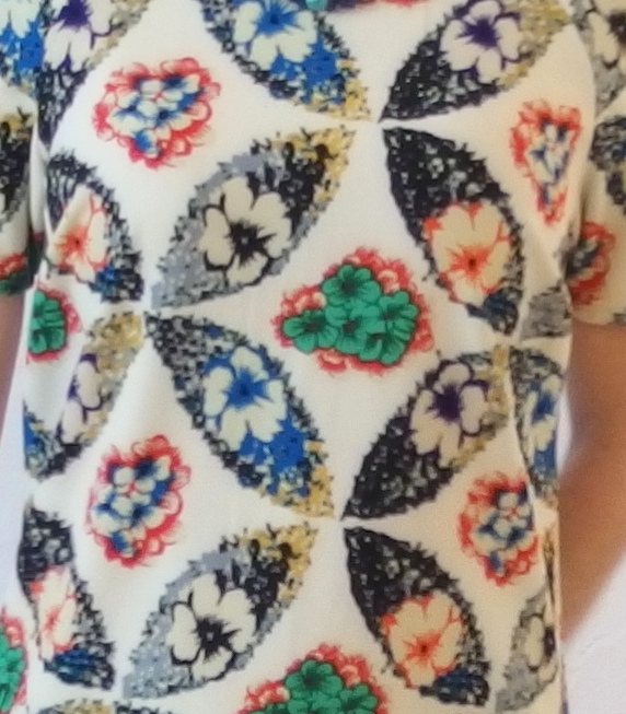 Coupe fluide avec ses pans arrondis qui forment des fentes (décentes) sur les côtés, son petit décolletté rond et ses manches courtes.